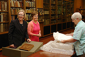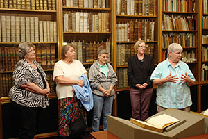 A delegation of Sisters of Loretto from Nerinx, Kentucky, brought the Badin Bible to Special Collections on July 15, 2014.