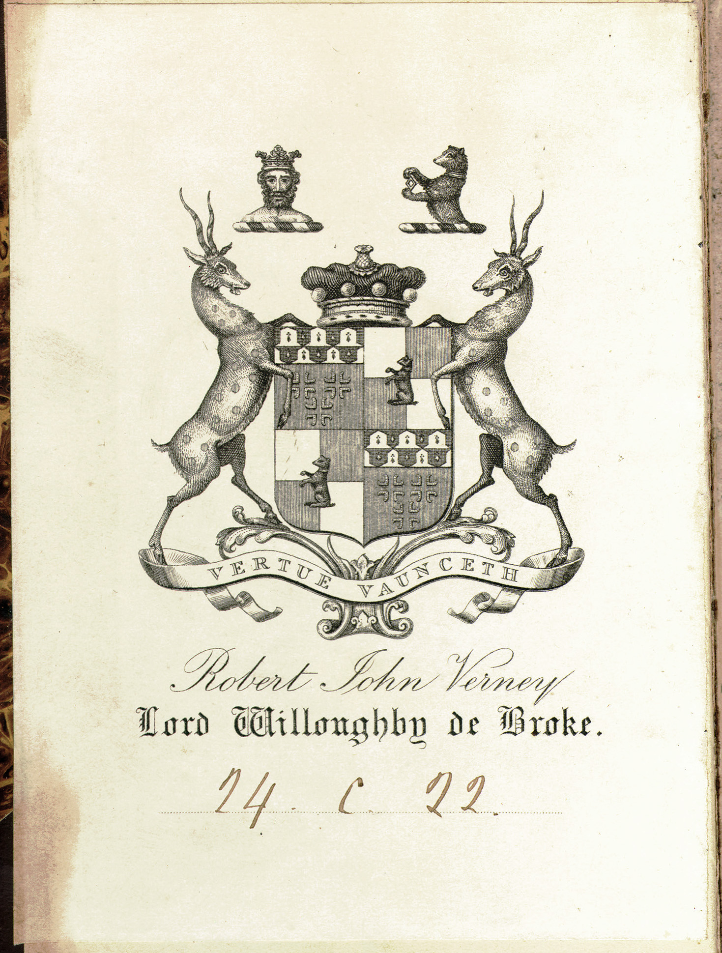 This coat-of-arms is that of Robert John Verney, 17th Baron Willoughby de Broke (1809-1862), and is taken from his bookplate.