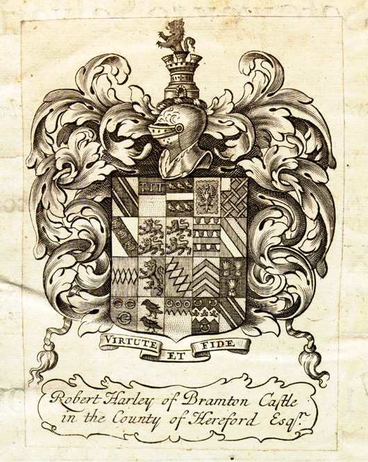 The coat-of-arms below is that of "Robert Harley of Brampton Castle" (most likely Sir Robert Harley, 1st Earl of Oxford, 1661-1724) and is taken from his bookplate.