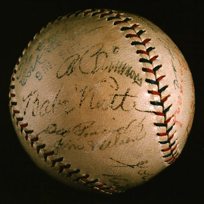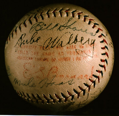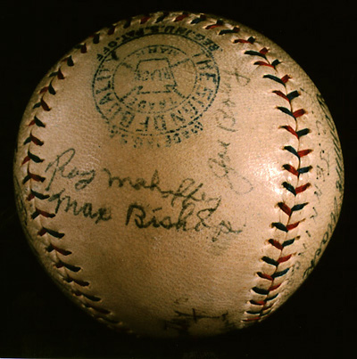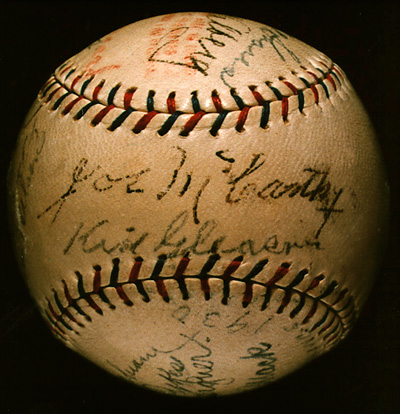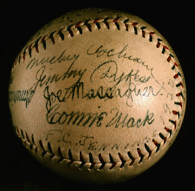 The presence of the Yankees' Babe Ruth and Chicago Cubs manager Joe McCarthy, as well as two members of the Cardinals, catchers Jimmie Wilson and George Puccinelli, suggests that the ball was signed during the 1930 World Series. Six members of the Athletics' regular lineup are present: second baseman Max Bishop, shortstop Joe Boley, third baseman Dykes, outfielders Simmons and Mule Haas, and catcher Cochrane. Walberg, Bill Shores, and Roy Mahaffey were third, fourth and fifth in innings pitched for the Athletics, after Earnshaw and Grove. Kid Gleason, best known as manager of the 1919 Chicago "Black Sox," was Mack's coach. Joe Massagner was a baseball writer from Havana, in Philadelphia covering the Series. Hall of Famers on this ball include Mack, Simmons, Cochrane, Ruth, and McCarthy.