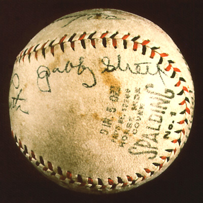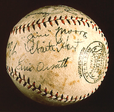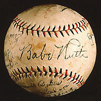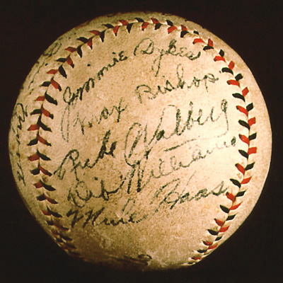 Notes: Signatures include four members of the 1931 Cardinals (Street, Johnson, Bottomley, and Orsatti) and seven members of the Philadelphia A's team they met and defeated in the '31 World Series (Moore, Hoyt, Dykes, Bishop, Walberg, Williams, and Haas), along with Babe Ruth. Since Ruth habitually "covered" the Series for the Christy Walsh sports syndicate, it seems likely that the ball was signed on that occasion. The presence of former Yankee star Waite Hoyt, a member of the A's only from June 30 to season's end, provides the strongest argument for a 1931 date (the same two teams appeared in the Series in 1930).