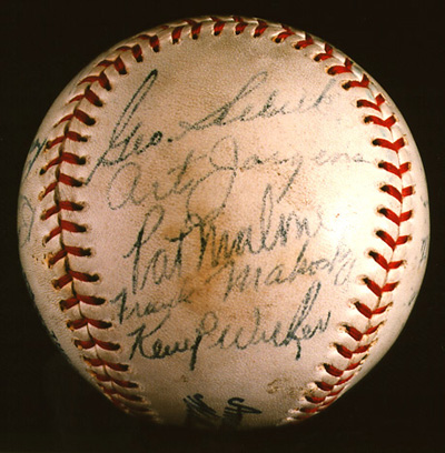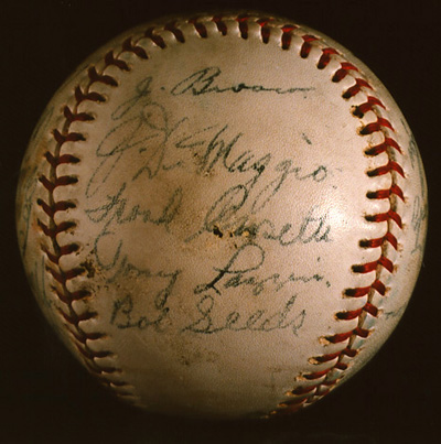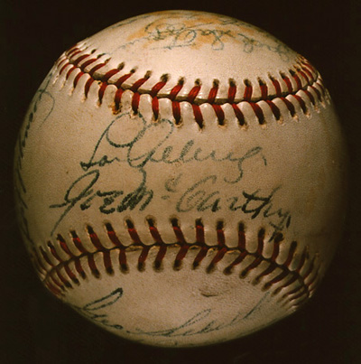 Signatures: Nineteen, in fountain pen. Back panel (sweet spot): Lou Gehrig, Joe McCarthy. Upper panel: Johnny Broaca, Joe Dimaggio, Frank Crosetti, Tony Lazzeri, Bob Seeds. Right side panel: Jack Saltzgaver, Monte Pearson, Earle Combs, Jumbo Brown, Red Rolfe. Lower panel: Bill Dickey, Roy Johnson. Left side panel: George Selkirk, Art Jorgens, Pat Malone, Frank Makosky, Kemp Wicker.