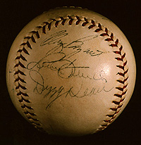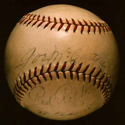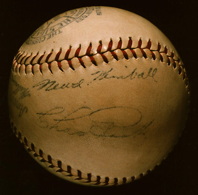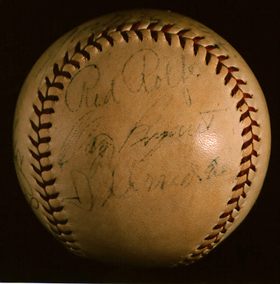 Notes: The players represented on this ball were all members of the 1938 Cubs and Yankees, the competitors in that year's World Series. Bryant, French, Dean, Kimball, and Root were Cubs' pitchers, and Red Corriden a coach. Joe McCarthy (Yankees' manager) and Red Rolfe (their third baseman) were in the opposite dugout. The presence together of Kimball and Dean is helpful in establishing a date; the two were Chicago teammates only in late-season 1938, when Kimball was called up from Birmingham of the Southern Association. Most likely, the ball was signed at the World Series.