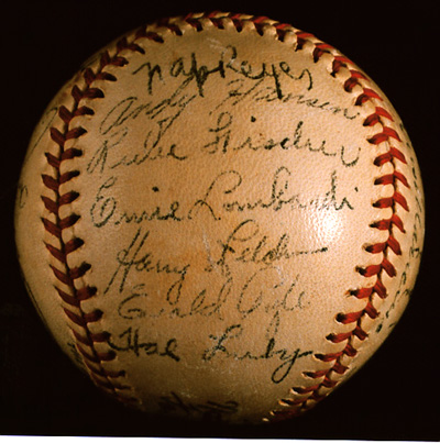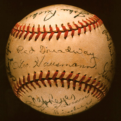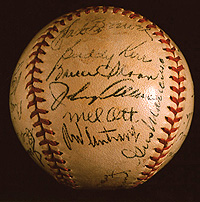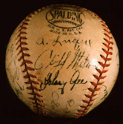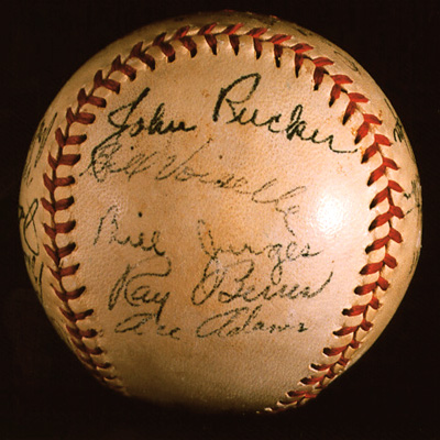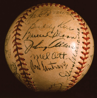 All the signers of this ball were active for New York in 1944, with the exception of Dolf Luque, a coach. Among those who saw significant playing time, the only notable absence is Medwick. Since pitcher Johnny Gee (who at six-foot nine exceeded the military's height limit by three inches) was purchased from Pittsburgh on 12 June, the ball must have been signed between that date and the end of the season.