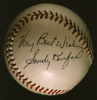 Notes: In 1954 the Brooklyn Dodgers offered a $14,000 signing bonus to a young, hard-throwing left-handed pitcher then enrolled at the University of Cincinnati, Sanford ("Sandy") Koufax (1935- ). Koufax reported to the Dodgers in 1955, and over the following eight seasons overcame considerable control problems to become one of the National League's best power pitchers, going an aggregate 68-60 as the team moved from Brooklyn's Ebbets Field to the Los Angeles Coliseum (1958) to its newly built West Coast home, Dodger Stadium (1962). In 1963, everything came together for Koufax. Dodger Stadium was proving an extraordinarily difficult park in which to hit; this, combined with new legislation increasing the size of the strike zone and, most importantly, the maturation of his considerable abilities, led to Koufax's emergence as baseball's best pitcher. Over the next four seasons he performed at a level matched by few, if any, pitchers in the game's history. Every year his earned run average was the league's best; he won ninety-seven games while losing twenty-seven, pitched four no-hitters, and in 1965 established a new single-season strikeout record with 382. He led the Dodgers to three National League pennants and two world championships, all the while pitching in pain due to a chronic arthritic condition in his left elbow. Following the 1966 season, acting on the medical advice that continued pitching would permanently damage his arm, Koufax retired at the age of thirty-one. In 1972 he became the youngest player ever elected to the Hall of Fame.