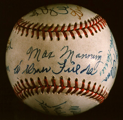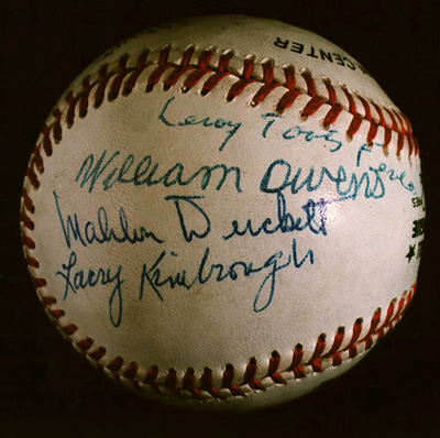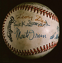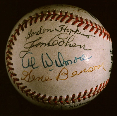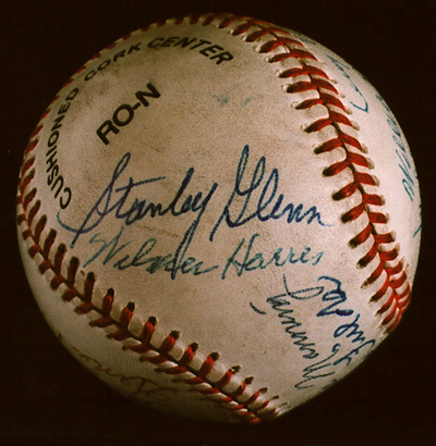 All of the players whose signatures appear on this ball were members of elite black teams, mostly in the years around World War II. Of the sixteen representatives of black baseball currently in the Hall of Fame, three are present. Leon Day was a very hard-throwing right-handed pitcher (and sometime position player) who spent much of his career with the Newark Eagles of the NNL; he and Satchel Paige are generally regarded as the best black hurlers of the era just prior to integration. Buck Leonard was a slugging first baseman for the Homestead (Pa.) Grays for seventeen seasons (1934-50), who teamed with catcher Josh Gibson to give the Grays one of the best offensive twosomes in the game's history. Monte Irvin was a fine outfielder for the Newark Eagles from 1937-42 and 1945-48; alone among the players on this ball, Irvin received the opportunity to play in the major leagues, and starred for the New York Giants in the early 'fifties. Less well known than these Hall-of-Famers, but excellent performers in their own right, were pitchers Red Fields and Max Manning, center fielder Gene Benson, and shortstop Bill Owens (a representative of a slightly earlier era, whose career spanned the years 1923-33). The signatures on the ball date from the early 1990s, and were probably obtained at one or more memorabilia shows or Negro Leagues reunions.