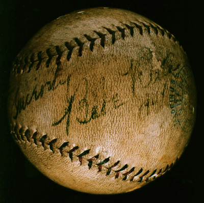 Notes: Available evidence suggests that this ball dates from the last weeks of Ruth's life, when he was a cancer patient in Memorial Hospital, New York. In the years following his retirement as a player (1935) Ruth's popularity remained high; he dabbled in the media, did endorsements, made personal appearances, and generally went about being Babe Ruth. He played a great deal of golf. Thanks to his agent Christy Walsh and his second wife, Claire Hodgson Ruth, who managed his income, he was financially secure. His great ambition was to manage in the major leagues, but an offer was never forthcoming. In late 1946 he was hospitalized with a malignant growth in his neck; the operation was not wholly successful, and he entered Memorial, a cancer center, on 26 June 1948. He last left the hospital on 26 July, to attend the premiere of the awful film The Babe Ruth Story. He died less than a month later, on 16 August 1948.