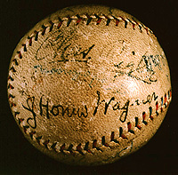 The 1925 World Series was one of the most dramatic in the game's history, with Wagner's old team, the Pittsburgh Pirates, coming back from a three games to one deficit to defeat the American League champion Washington Nationals. During his career Wagner had permitted relatively few articles to be published over his byline, but he agreed to "cover" the 1925 Series for the Christy Walsh Syndicate, and viewed the games from the press box. The main inscription suggests that the ball was obtained by its original owner, Chicago American sportswriter Emmit Jennings, at Game Three in Washington on 10 October. Brick Owens, who penned the inscription, and Cy Rigler were two of the four umpires chosen to work the Series. As it happens, in this game Rigler was involved in one of the most controversial calls in Series history - which may account for the presence of his signature. In the eighth inning, with Washington leading 4-3, Pirates catcher Earl Smith drove a ball deep to right-center field, towards the temporary bleachers set up to handle the overflow crowd. Hall of Fame outfielder Sam Rice raced to the seats and leaped into the crowd as the drive came down; after a noticeable delay he emerged holding the ball, and Rigler declared Smith out. Pirates manager Bill McKechnie protested vociferously that none of the umpires had actually seen Rice make the catch, but Rigler stood by his call, and the game ended in a 4-3 Washington win. That winter the rule book was emended to make any fair ball entering the stands a home run.
