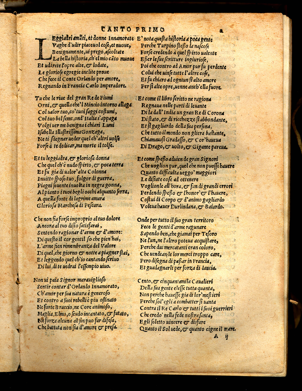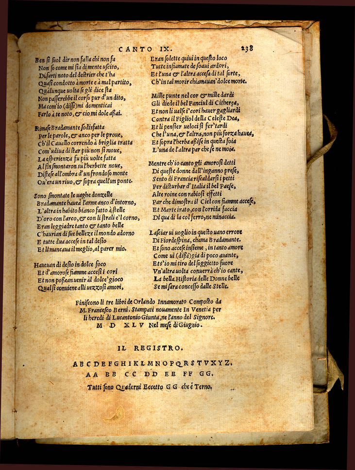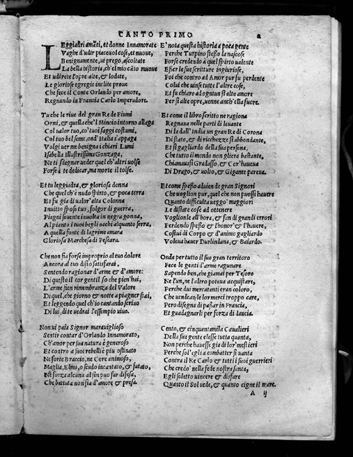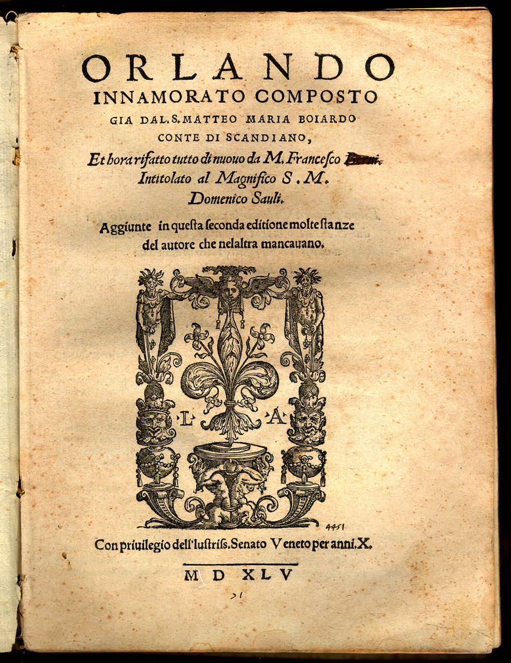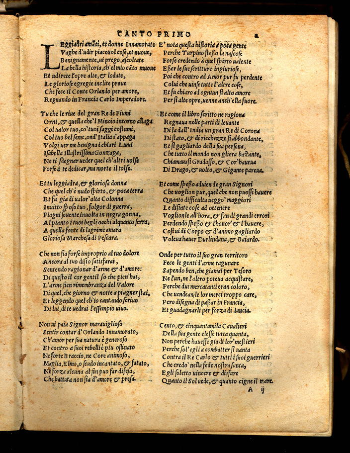 Matteo Maria Boiardo. Orlando Innamorato Composto. Venetia: li heredi di Lucantonio Giunta, 1545. Boiardo served the dukes of Ferrara and was appointed governor of Reggio. In addition to the Orlando Boiardo translated Lucian and Apuleius into Italian. His Orlando Innamorato combines both the love adventures of the Arthurian romance tradition and the military honor, patriotism and religion of the Carolingian cycle. Boiardo began writing the poem in 1476, but the first two parts were not published until 1483 and they were revised in 1496. Written in an erudite and dialectical language and composed in an old-fashioned style, the poem was not popular in its time, but it strongly influenced Ariosto and the further development of epic poetry in Italy, Spain and the Indies. |