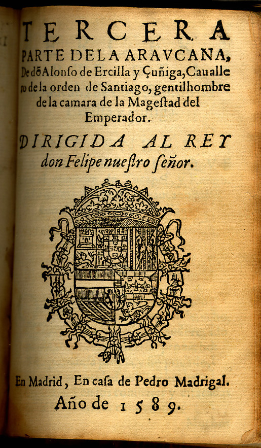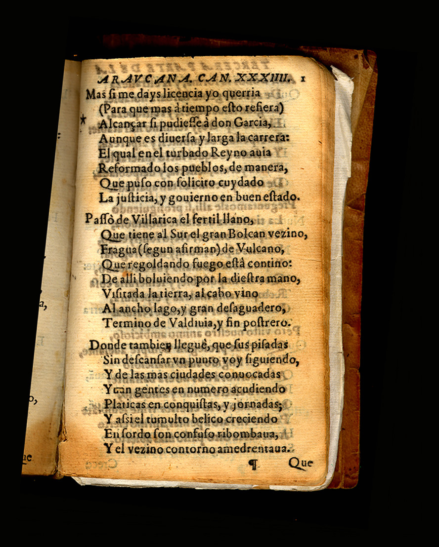 Alonso de Ercilla y Zuniga. La Araucana. Madrid: Casa de Pedro Madrigal, 1589. Ercilla grew up in the court of the prince, later king Philip II, and received an excellent renaissance education. He traveled to Chile in 1555 where he fought the untamed Araucanian Indians. His poem, La Araucana, published in three installments (1569, 1578, 1589) is partly an account of Ercilla's own experiences on the battlefield against the Indians, but also narrates other events of European history and the chivalric tradition in the manner of Ariosto. This is the first epic poem written in the New World and became a model for succeeding generations. Also, for the first time in the epic tradition the main characters are Araucanian Indians. Interestingly these Indians are portrayed as being guided by the concept of honor. La Araucana originally had 35 cantos. After the author's death an apocryphal section was added between cantos 34 and 35 consisting of an extension of four folios onto canto 34 plus two full cantos listed as cantos 35 and 36. From then on all editions have been printed with 37 cantos. The opening shows the start of the added material on the right hand page. Note the renumbering of the pages. |