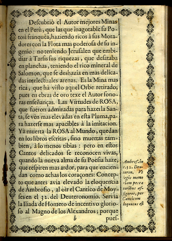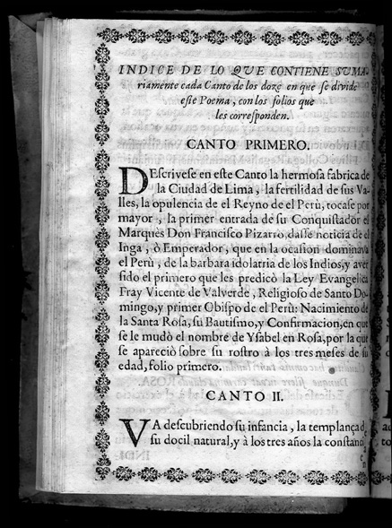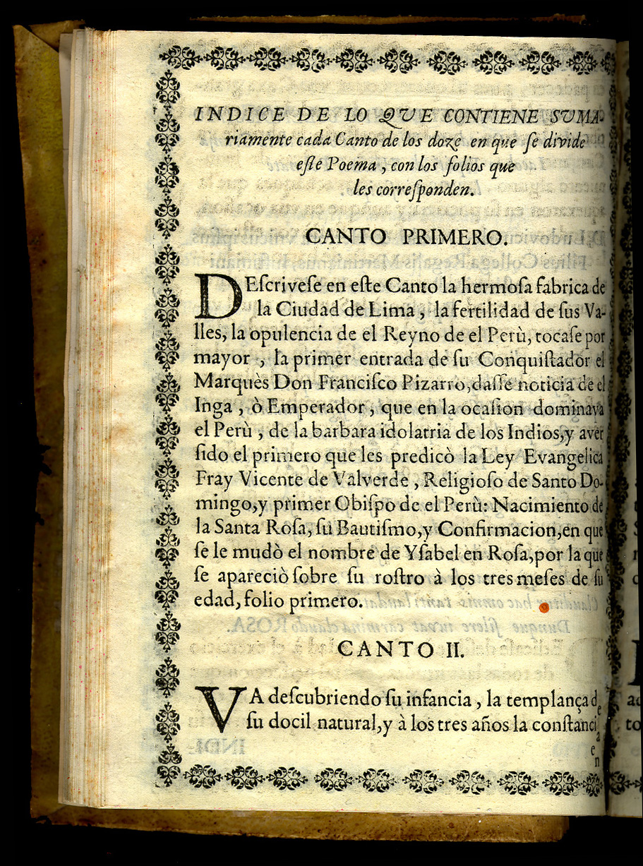 Luis Antonio de Oviedo y Herrera. Vida de Santa Rosa de Santa Maria. Lima[?]: 1711. Oviedo y Herrera studied at the University of Salamanca and later embarked on a military career. He was appointed "corregidor" of Potosi (1667) and settled in Lima by 1686 when he received the title Count of La Granja. Oviedo y Herrera wrote many ballads ("romances"), a Poema sacro de la Pasion and an important religious epic in verse about the life of Saint Rosa of Lima. Besides the first edition of the Life of Saint Rosa, which is on display, the Durand Collection also has several other early hagiographic works devoted to the life of this holy woman, the first Saint of America. |