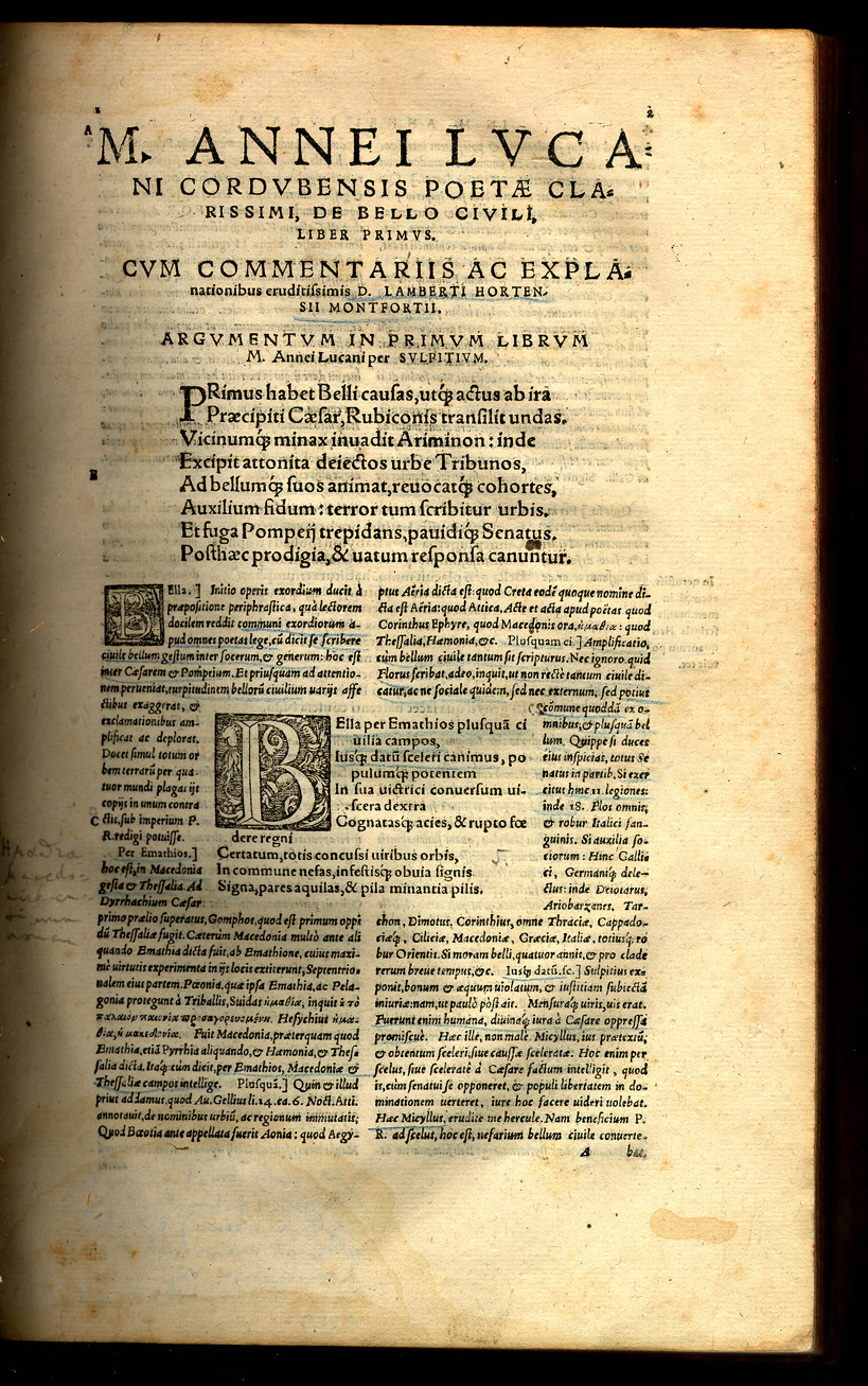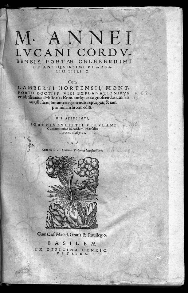 Lucan. Pharsaliae Libri X. Basileae: Henric Petrina, 1578. Grandson of the elder Seneca, Lucan was a poet and rhetorician as well as the author of an historical epic on the civil war, known as the Pharsalia (named for one of the battles between Caesar and Pompey). The poem, written in a style that imitates Virgil's Aeneid, shows the republican ideology of Lucan and his hatred of Nero's tyranny. In this work events are determined by the actions of men, and the gods do not have a role. Lucan's Pharsalia was popular during the Middle Ages. It was translated into Spanish in 1544 by Martin Lasso de Oropesa and in 1600 Christopher Marlowe translated the first book of the Pharsalia into English. Lucan also influenced the French classic dramatists of the 17th century, especially Corneille. |