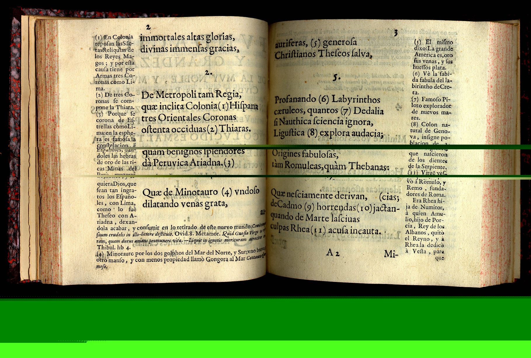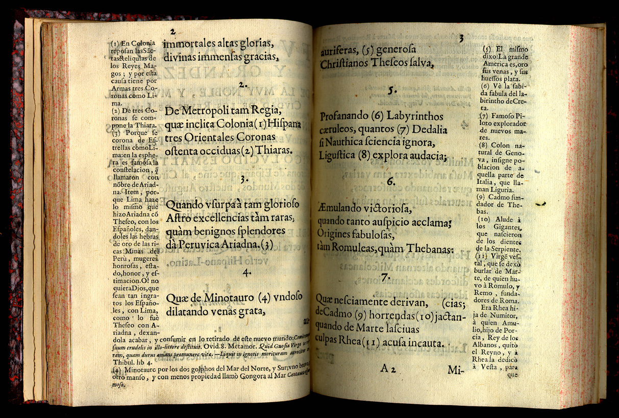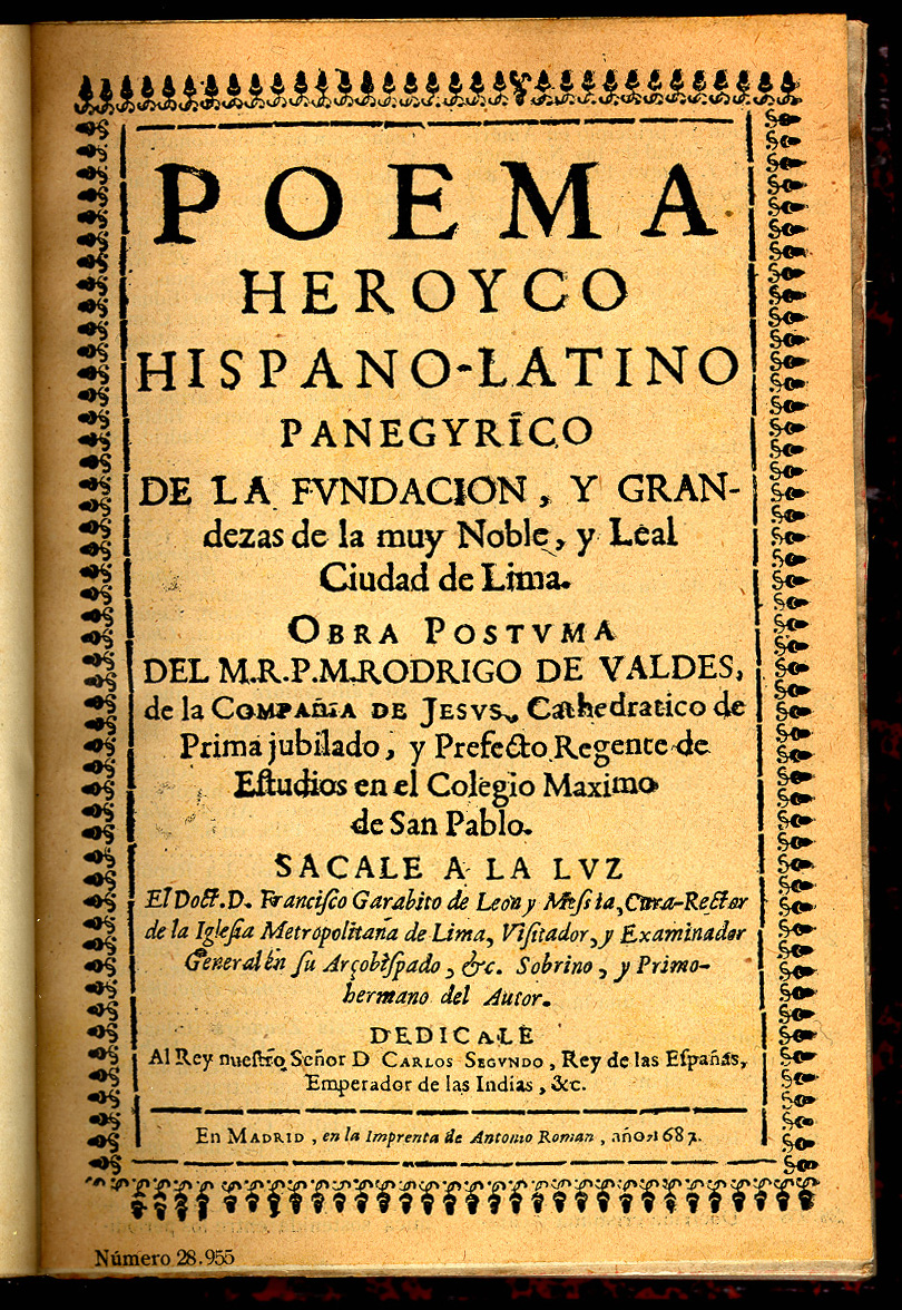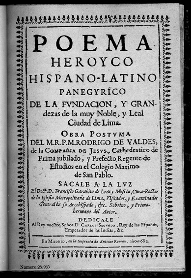 Rodrigo de Valdes. Poema Heroyco. Madrid: Antonio Roman, 1687. Valdes was a Peruvian Jesuit and poet, famous as scholar and a preacher. He worked for the Inquisition in Lima. Late in his life, probably suffering from mental disorders, Valdes destroyed his original manuscripts. Posthumously, his nephew Garavito de Leon published his Poema, which is a "rhymed chronicle" relating historical events in verse. Note that the text also contains a marginal commentary. |