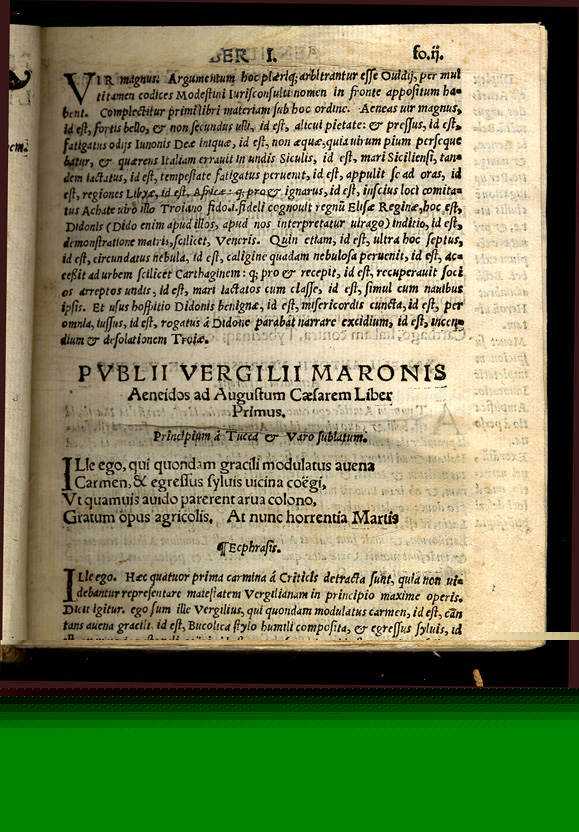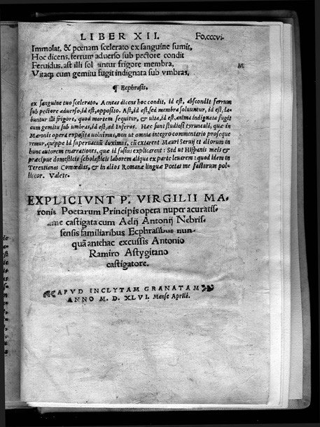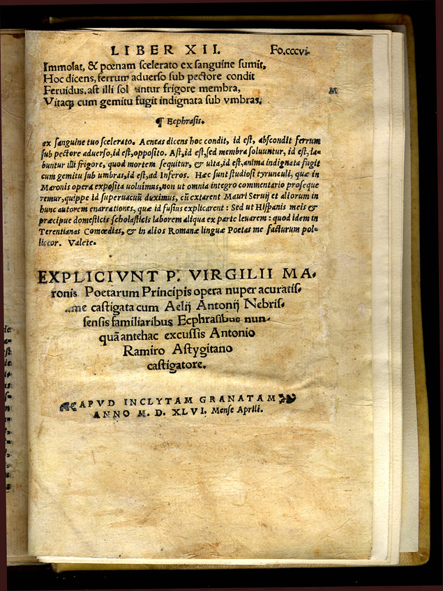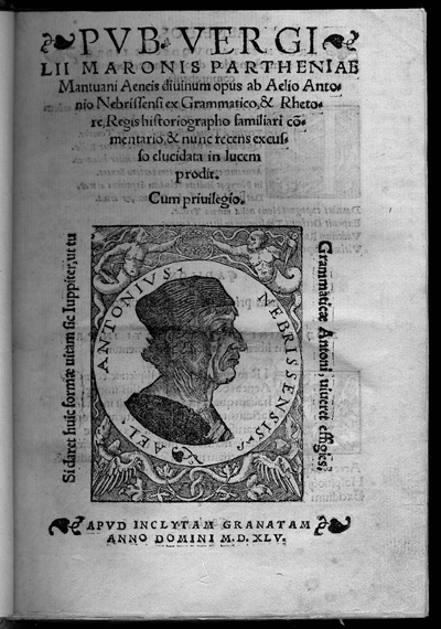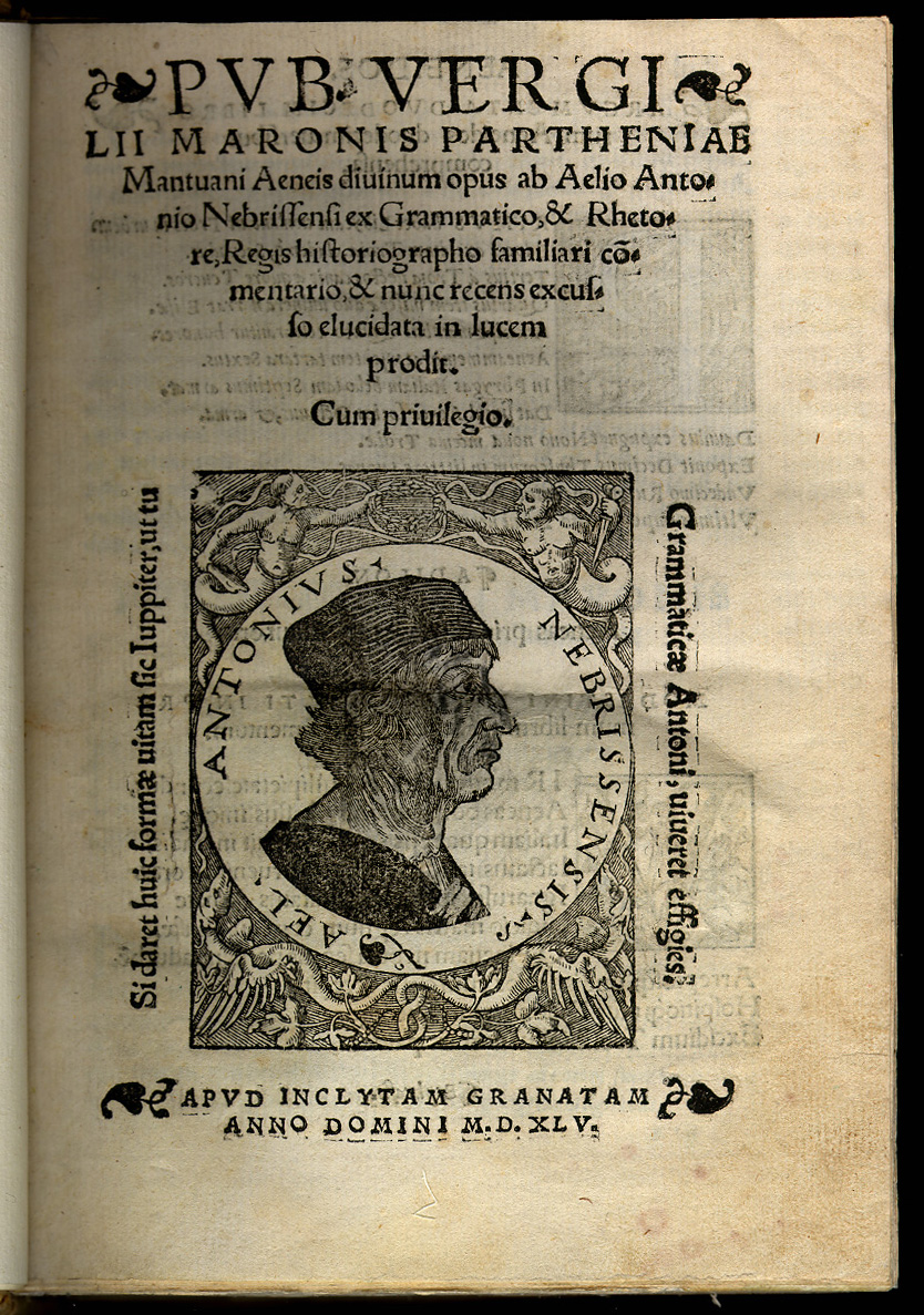 Virgil. Aeneid. edited with commentary by Antonio de Nebrija. Apvd Inclytam Granatam, 1545/1546. The great epic of ancient Rome in which Virgil links the founding of Rome to Greek antiquity, tracing the origins of the Roman people back to the Trojan prince Aeneas. As in Homer, the gods play an important role in the affairs of men throughout the work. Elio Antonio de Nebrija (1441-1522), a Spanish humanist, studied at Salamanca and Bologna and taught grammar and rhetoric at Salamanca and Alcala. In 1492 he published his Gramatica castellana, the first grammar in any vernacular language. Nebrija worked in the edition of the Polyglot Bible of Alcala and prepared critical editions of Sedulius, Prudentius, Persius and Virgil. |