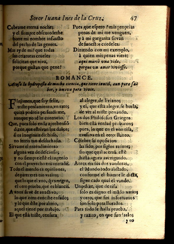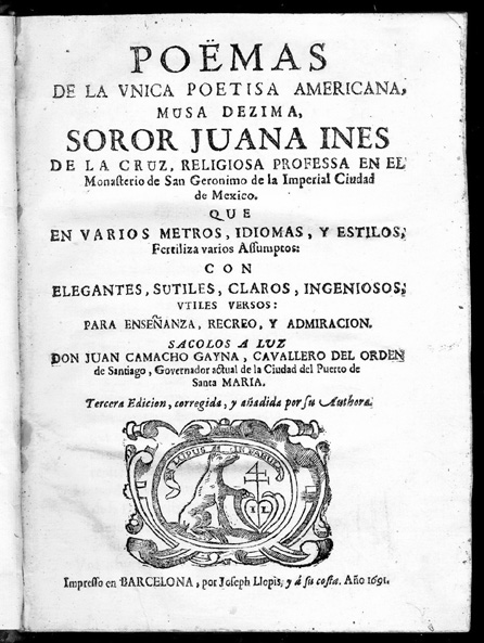 Sor Juana Inés de la Cruz. Poëmas de la unica poetisa Americana. vol. 1 of 3. Barcelona: Joseph Llopis, 1691. Sor Juana Inés de la Cruz was a nun gifted with immense knowledge of letters and the sciences. She was baptized Juana Ramírez de Asbaje, the illegitimate daughter of a Spanish soldier and a Mexican woman. Her autobiography appears in one of her writings, the Respuesta a la muy Ilustre Sor Filotea de la Cruz (a letter addressed to the Bishop of Puebla, who wrote under a pseudonym). She wrote a considerable amount of lyric poetry: poems for special events, poems about portraits, funerary, philosophical, religious and popular poems; religious theater, comedies and the like. Her collected works appeared for the first time in a volume entitled Inundación castálida de la única poetisa... (Madrid, 1689), followed by a Segunda volumen ... (Seville, 1692) and a third volume in 1700: Fama y obras póstumas (Madrid). The Durand Collection has the third edition of the first volume with its altered title and a text corrected and enlarged by the author. |