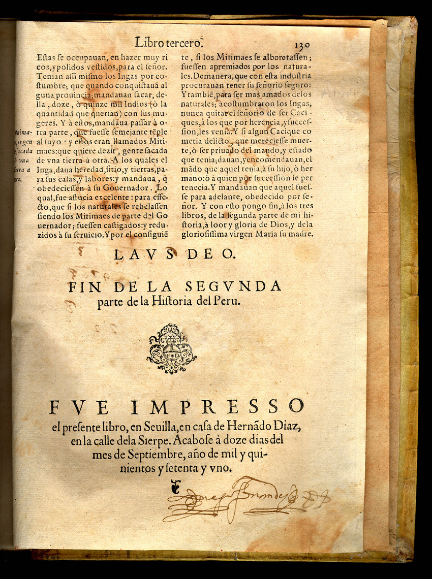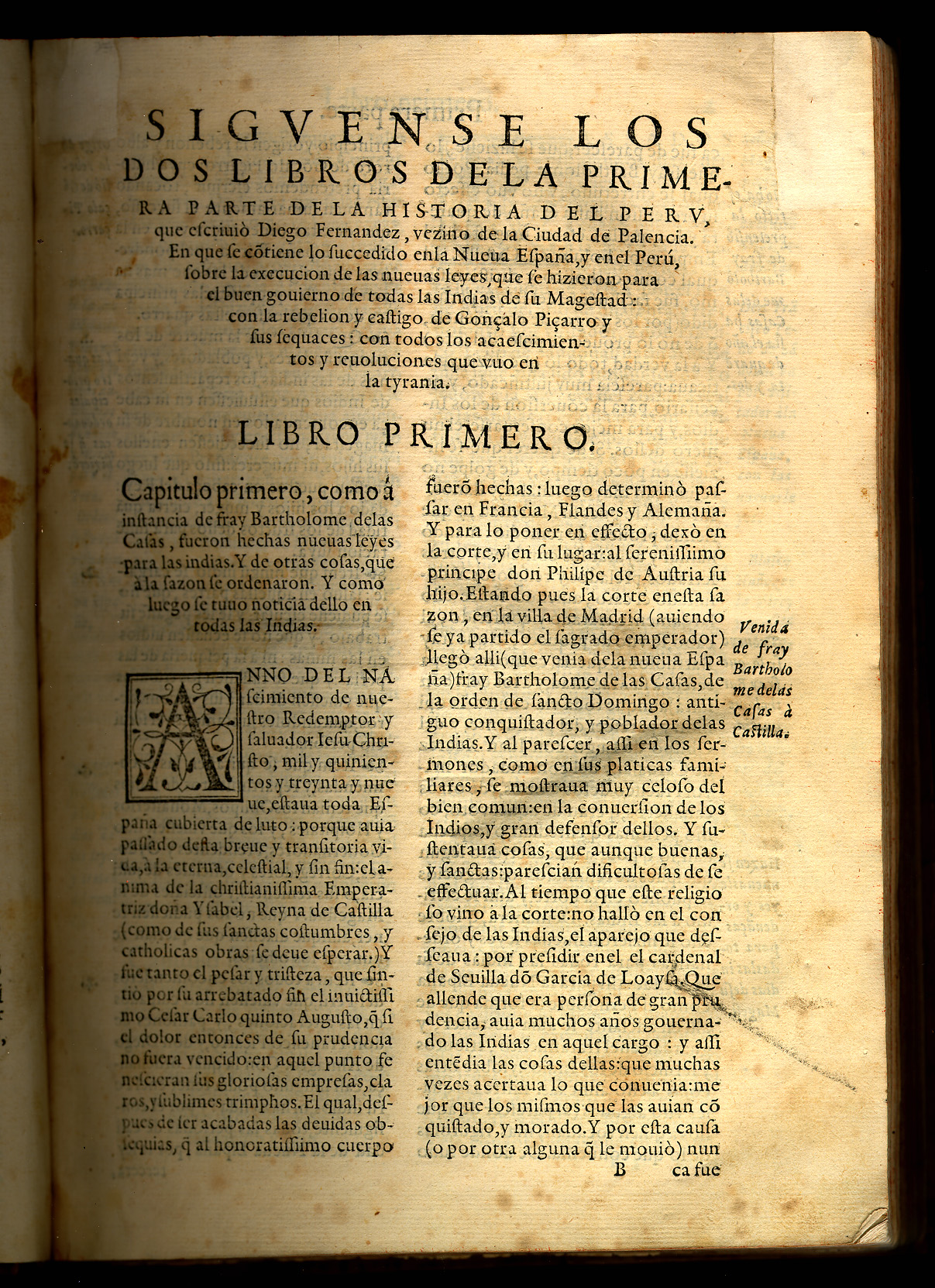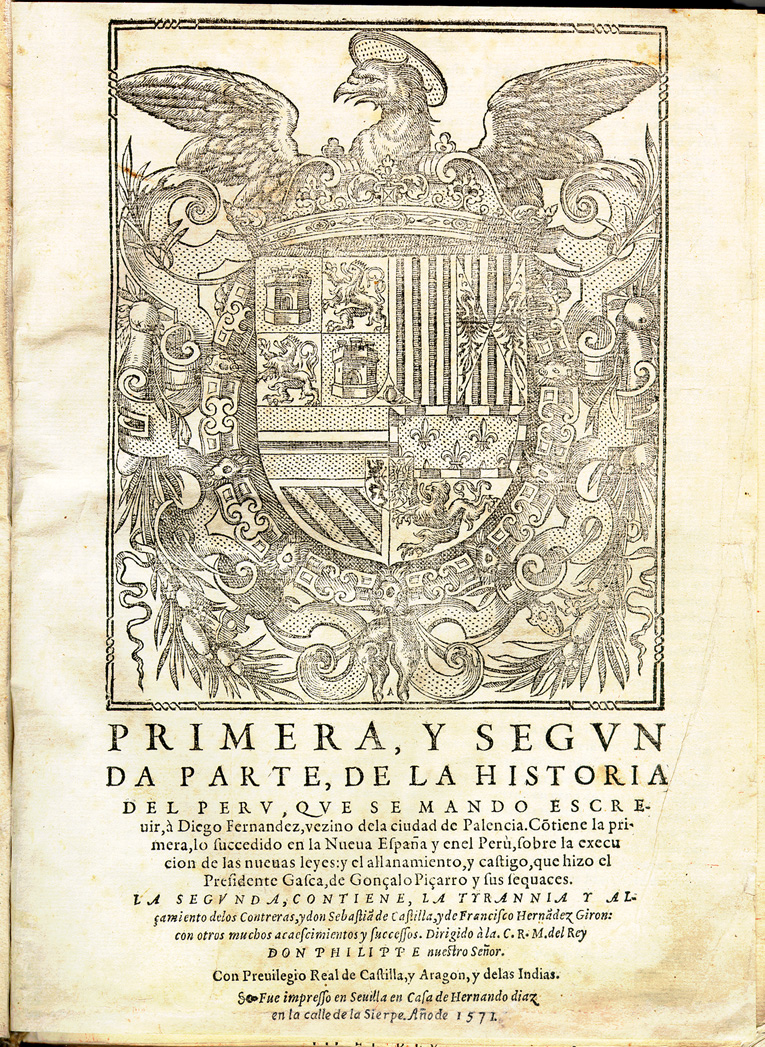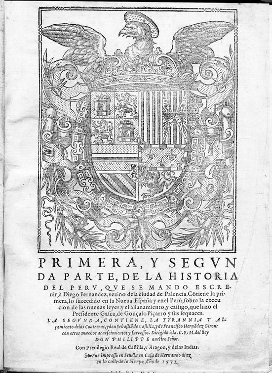Diego Fernández. Primera, y segunda parte, de la historia del Peru. Seuilla: Casa de Hernando Diaz, 1571. Diego Fernández was born in Palencia, Spain; his nickname was "the Palentino." He was a soldier in Peru during the civil wars around the middle of the 16th century. Later, working as a scribe in Lima, he was named official chronicler of Hernández Girón's rebellion. He was also asked to write about the Gonzalo Pizarro uprising against royal authority. The narratives of these civil wars constitute the first and second parts of his Historia. The "Palentino" observed Girón's rebellion carefully, as it developed, and his account is of exceptional historical value. On the other hand his description of Gonzalo Pizarro's activities seems superficial and insincere. His disapproving portrayal of Gonzalo contrasts with that of Garcilaso Inca, recorded years later in his General History of Peru (1617). |