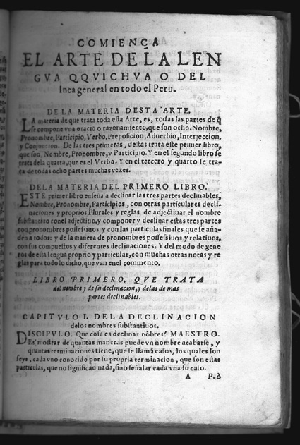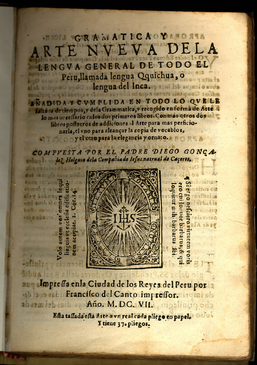 Diego González Holguín. Gramatica y arte nueva de la lengua general de todo el Peru llamada lengua Qquichua, o lengua del Inca. Ciudad de Los Reyes (Lima): Francisco del Canto, 1607. Diego González Holguín arrived in Peru in 1581 as a member of a Jesuit mission, and then lived in different regions of the viceroyalty. His Gramatica y arte nueva was the result of twenty-five years of studying popular spoken language in Cuzco and critically revising earlier studies on the subject like the Quechua vocabulary prepared by Fray Domingo de Santo Tomás (Valladolid, 1560). Holguín was also the author of Vocabulario de la lengua general de todo el Peru, published in Lima in 1608, which is a continuation of the Gramatica. It includes more words than previous vocabularies and an innovative orthography (the Durand Collection holds two copies of this valuable first edition, and Notre Dame retains a third in its Rare Book Collection). In 1579 the University of Lima created the chair of Quechua studies and it was decided that priests, bachelors and licentiates were obliged to study the "general language." Books written by González de Holguín were published by the second printer to work in Lima, Francisco del Canto (son of his namesake who was also a printer in Medina del Campo, Spain, from 1555). These books produced during the first years of printing in Peru (from 1584) are extremely rare. |