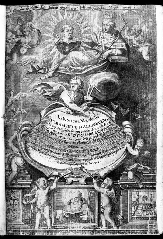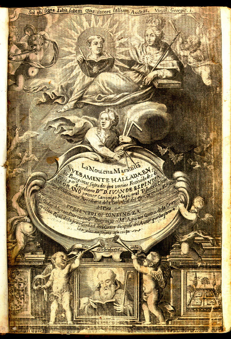 Juan de Espinosa Medrano. La novena maravilla. Valladolid: Ioseph de Rueda, 1695. Juan de Espinosa Medrano was probably a mestizo, nicknamed "El Lunarejo," who studied in Cuzco as a child and showed unusual talent for languages and music. He mastered Latin, Greek, Hebrew and was the first great Quechua writer. In that language he composed several theatrical pieces, poetry and a translation of Virgil. He held university chairs in Arts and Theology, was archdeacon in the Cathedral of Cuzco, and composed the Philosophia Thomistica, published in Rome in 1688. After his death one of Medrano's disciples, a priest from Cuzco named Agustín Cortez de la Cruz, published thirty sermons written by "Lunarejo". The volume was entitled La novena maravilla and included his famous sermon to Santa Rosa de Lima, the first American saint. |