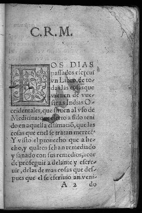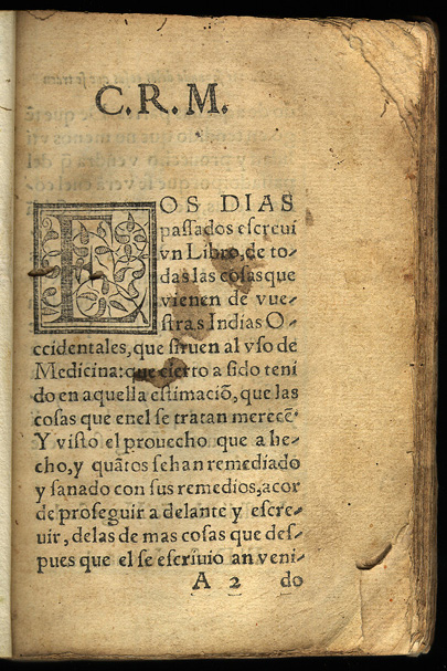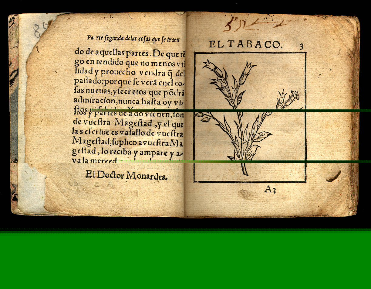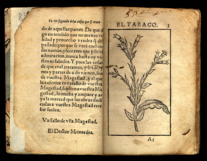 Nicolás Monardes. Historia medicinal. pt. 2. Seuilla: Casa de Alonso Escriuano Impressor, 1571. Nicolás Monardes was a medical doctor and businessman. He belonged to the school of "humanist galenism," which opposed the influence of medieval Arabic science. Monardes conducted trade between Seville and the New World, sending cloth and black slaves to America and obtaining leather and medicinal plants. Although he never visited the Indies, the large quantity of American products reaching Seville allowed him to write his most important work, the Historia medicinal, which was originally published in three parts (1565, 1571 and 1574). Monardes drew on indigenous practices and his own medical experimentation to introduce numerous medicinal products from the New World to Europe. The Segunda parte includes the first known treatise on the healing properties of the tobacco leaf. Among other medical novelties, he recommended the use of ground tail bone of armadillo for earaches. The significance of Monardes' work can be appreciated by the numerous translations made during his lifetime: six in Italian, five in Latin, three in French, and three in English; fourteen additional translations were published in the next century. The Durand Collection contains the rare original edition of the second part, which was never reprinted separately. |