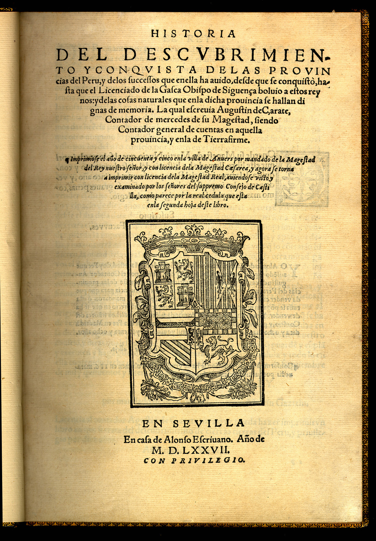 Agustín de Zárate. Historia del descubrimiento y conquista de las provincias del Peru. Sevilla: En casa de Alfonso Escriuano,1577. Agustín de Zárate, an accountant, travelled to the Indies in 1543 and spent a year in Peru supporting the rebellion of Gonzalo Pizarro against the king. On his return to Spain he was accused of treason and was jailed in Valladolid. The Historia was partially written during the time of his imprisonment and was published in Antwerp in 1555. Dutch and Italian translations appeared in 1563 and an English version was published in 1581. Zárate's book was reprinted in 1577 with significant alterations. His work is a complete account of the discovery, conquest and civil wars of Peru. He was an eyewitness to many of the events narrated, and his overall work has been praised for its objectivity. The section dealing with the discovery follows the accounts of Rodrigo Lozano and Nicolás de Rivera el Viejo, according to Raúl Porras Barrenechea. His main sources on Gonzalo Pizarro's rebellion were the papers of bishop La Gasca. Zárate's Historia is one of the first texts to describe the Incan empire, and it is an invaluable source for Andean ethnography. Together with Historia general de las Indias (Amberes, 1554) by López de Gómara, it is one of the principal sources for the Royal Commentaries by Garcilaso Inca de la Vega. |