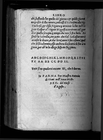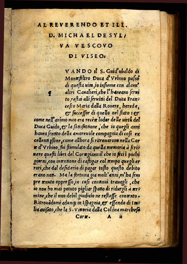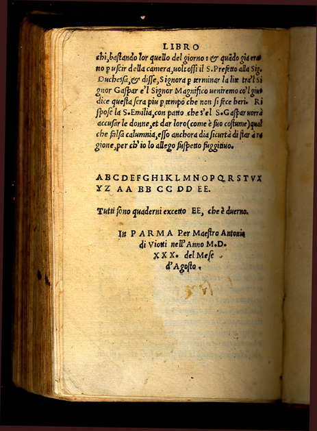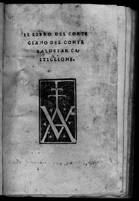 Castiglione, Baldesar. Il libro del cortegiano. Parma: Maestro Antonio di Viotti, 1530. Count Baldesar Castiglione was an Italian diplomat and courtier, educated at the humanist school of Giorgio Merula and Demetrius Chalcondyles. He entered the service of the Duke of Urbino in 1507, where he met many distinguished humanists such as Pietro Bembo. He traveled as a diplomat to England, and in 1525 was sent to Spain as papal nuncio to Emperor Charles V. His famous work Il cortegiano was an important handbook of aristocratic manners during the Renaissance. It was first printed in Venice in 1528 by Aldo Romano and Andrea d'Asola. The edition on display was printed in Parma by Antonio di Viotti in 1530. Viotti had been a minor printer up to this year, when his activities intensified. Juan Boscán, one of the first poets to use Italian verses in Spanish poetry, translated Il cortegiano into Spanish. It was published in Barcelona in 1534 by Pedro Mompezat. The Durand Collection holds a copy of this translation, printed in Antwerp in 1561 by the widow of Martin Nuncio. After Boscán's translation, Jacques Colin's French version was printed in Lyon in 1537 by Denys de Harsy. Sir Thomas Hobbes's translation, The Courtyer, was printed in London in 1561 by Wyllyam Seres and exerted enormous influence on English social life in the age of Shakespeare and Philip Sydney. |