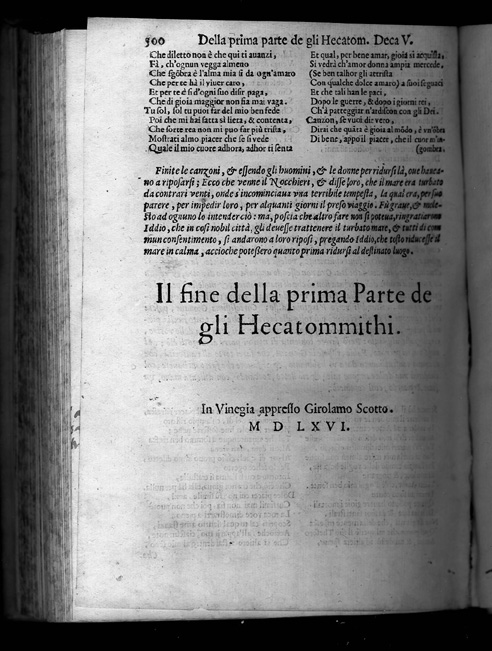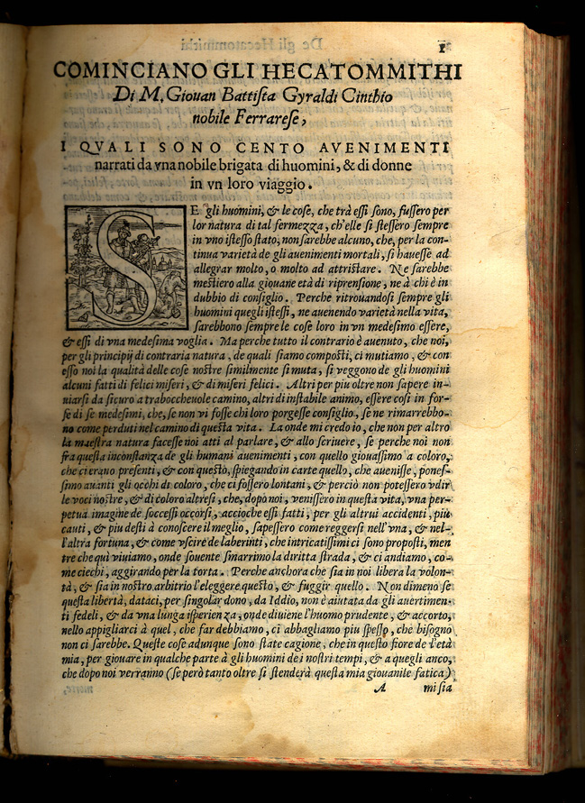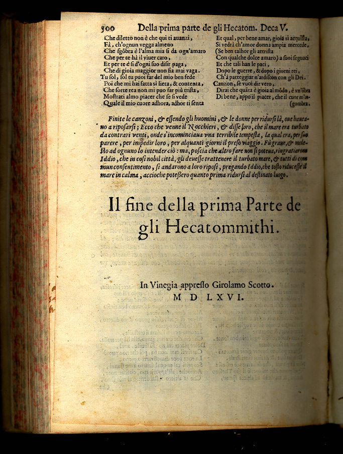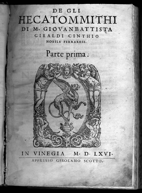Giovanbattista Giraldi (Ferrara, 1504 - Ferrara, 1573). De Gli Hecatommithi. 2 vols. Vinegia: Girolamo Scotto, 1566. Giambattista Giraldi, also called Cinthio, wrote tragedies and satirical works, sonnets and treatises on epic and dramatic literary theory. His Hecatommithi, 112 "nouvelles" collected in immitation of Boccaccio's Decameron, consists of moralistic narratives which were soon imitated and translated in France, Spain and England. Giraldi's story of the "Moor of Venice" inspired Shakespare's Othello. The Durand Collection copy is the second edition, published in Venice in 1566 by Girolamo Scotto. It was corrected and improved, although it lacks some final sections of the second part of the princeps. The first edition was published in 1565 in Monte Regae by Lionardo Torrentino. There is a Spanish translation of the first part of the Hecatommithi, made by Luys Gaitan de Vozmediano, published in Toledo by P. Rodriguez in 1590 with the title: Primera parte de las cien novelas. In 1968 Henry L. Snuggs published Giraldi Cinthio on romances (Lexington, University of Kentucky Press), the first English translation of the Discorso intorno al comporre dei romanzo. This is Giraldi's theory of epic poetry and vindication of Ariosto's Orlando furioso. |