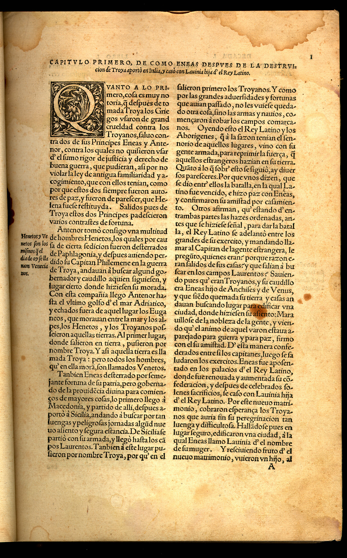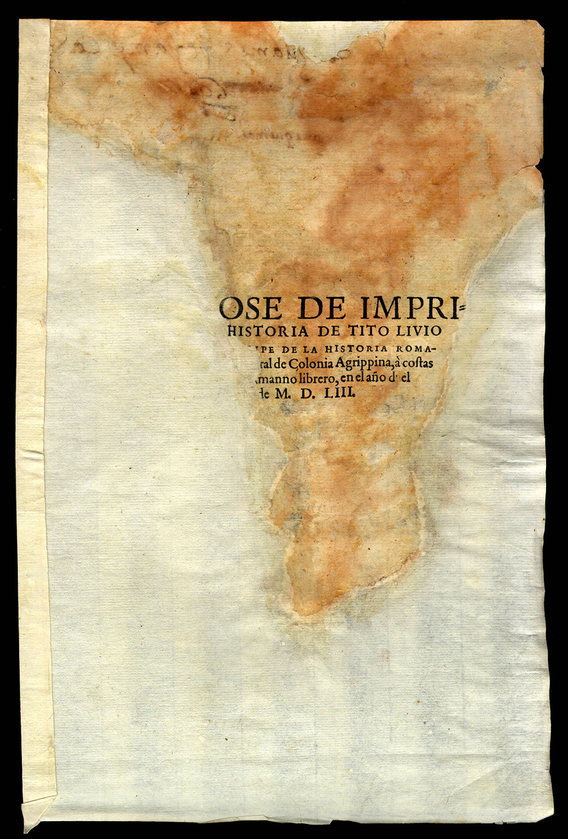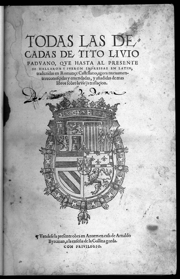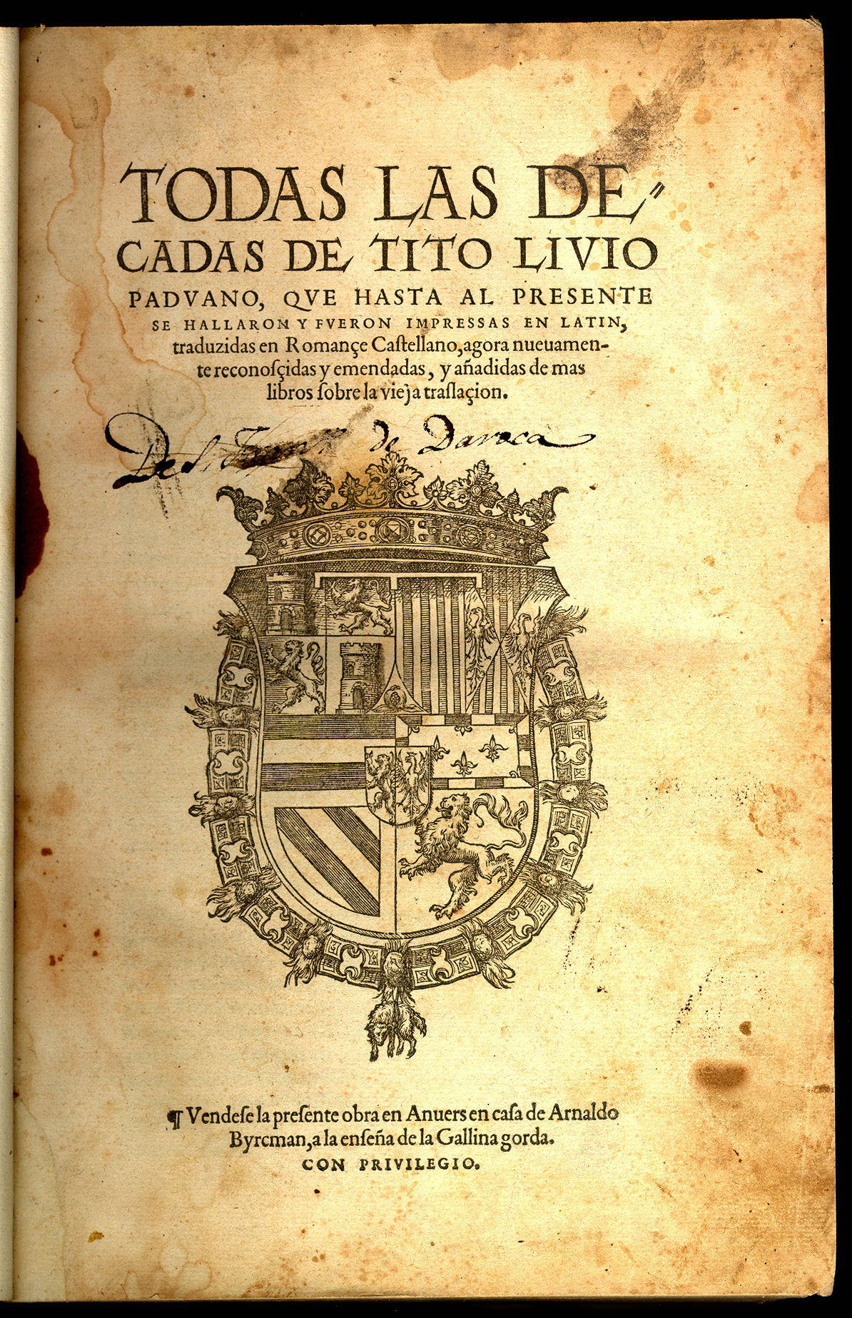 Livy (Titus Livius) (Patavium, Venetia, 59/64 BC - Patavium, 17 AD). Todas las Decadas de Tito Livio. Anuers: Arnaldo Byrcman, 1553. Along with Sallust and Tacitus, Livy was one of the great Roman historians. He saw history in terms of human characters and sought to understand the course of history from that perspective. This was Livy's major achievement, and it became an important influence on classical historians --such as Tacitus--, and on Christian, Renaissance and Western historiography right up to the 19th century. Livy made no claims to original research or method, only of his literary qualities. His purpose was moralizing, and thus he showed his readers examples from the remote Roman past, when society was supposedly uncorrupted and simple. Livy emphasizes that history is humanistic, although humans like to think of their origin as divine. At least two Spanish translations were published before the 1553 edition of Arnaldo Byrcman held by the Durand Collection: Las decadas de Tito Livio, in Salamanca (1497), with a translation attributed to Pedro López de Ayala; and Las quatorze decadas de Tito Livio, historiador de los romanos, in Zaragoza (1520), printed by Jorge Coci. Arnaldo Byrcman paid for the 1552 edition of Livy's work that was published in 1552 and printed by Augustin Frisio in Strasburg (Argentina). The translation was done by Pedro de la Vega, first published by Pedro Villaqurán in Toledo in 1516, then corrected and expanded in two chapters (book X, Decade IV) by Francisco de Enzinas. Being a booktrader in Antwerp, Byrcman changed the title and last pages in 1553, printed his name as publisher, and sold this "new" edition in his house, "under the mark of the fat chicken." |
