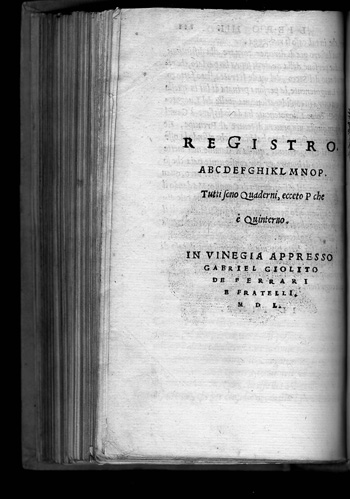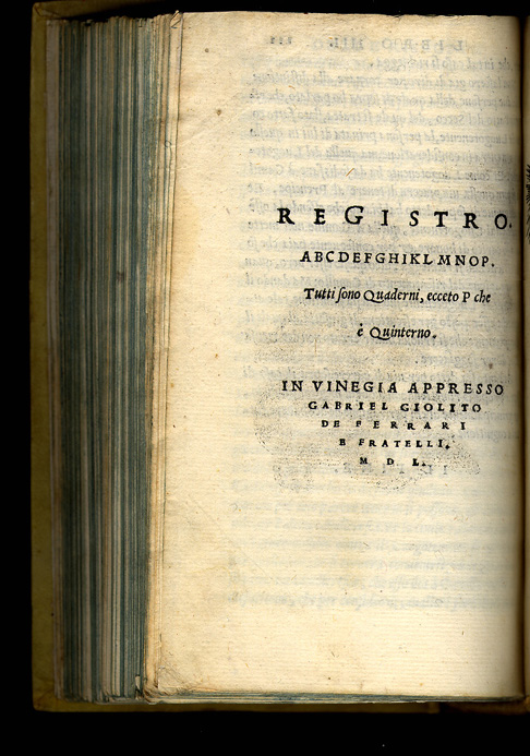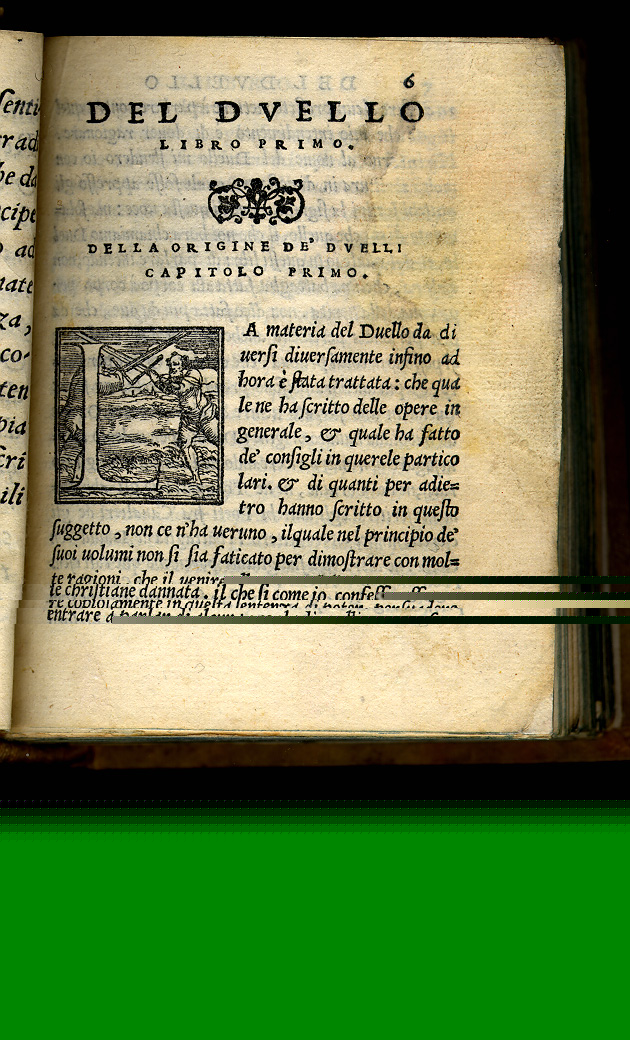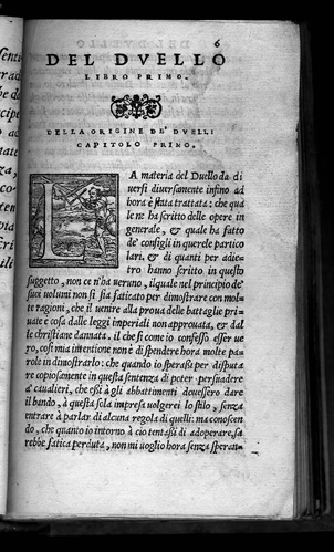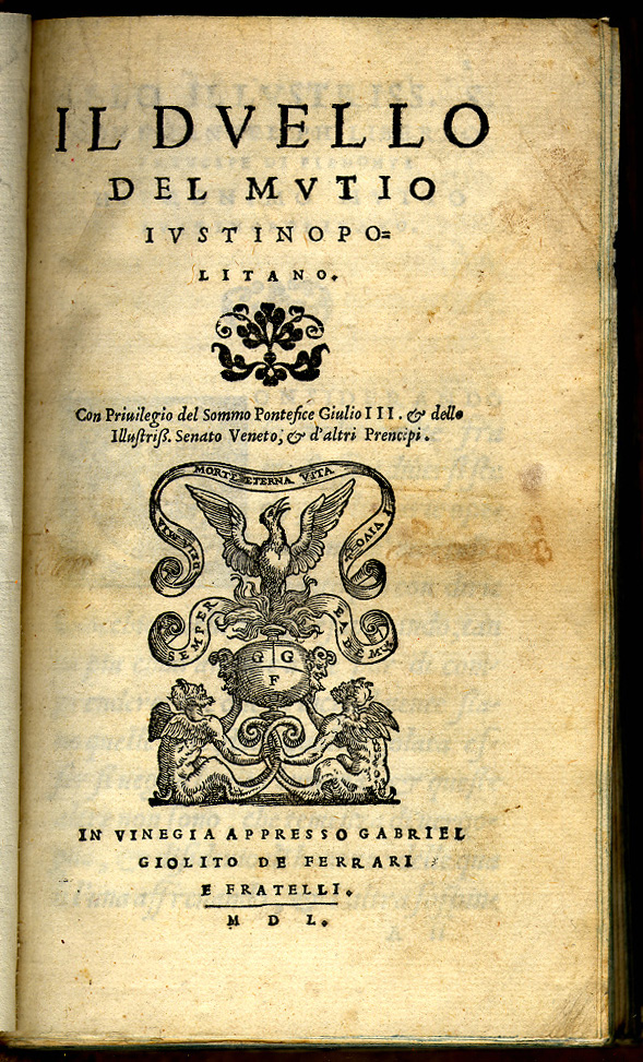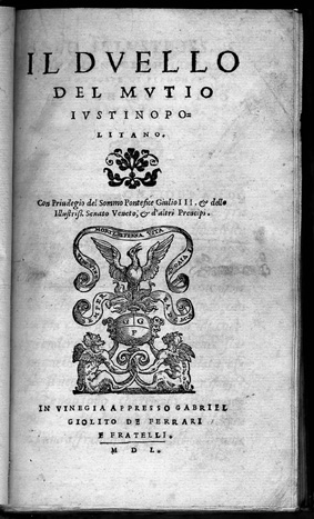 Hieronimo Mutio (Padova, 1494 - Villa della Panaretta, Toscana,1576). Il Duello. Vinegia: Gabriel Giolito de Ferrari e Fratelli, 1550. Muzio or Mutio, known as "Iustinopolitano", was an Italian writer whose work covered a variety of different subjects and interests. In 1550 he went to Venice to contact Giolito's printing house in order to publish his works: epistles, poetry and literary theory (Rime diverse and Arte poetica) and his treatise entitled Il duello ("The Duel"), which appeared with Le resposte cavalleresche del Mutio ("Mutio's chivalric replies"), letters in response to different gentlemen of his time related to the practice of duels and problems of honor. Il duello gives rules for a practice which it neither recommends nor disapproves. It is intended to serve as a handbook for gentlemen. The Durand collection holds the first edition of Il duelo--published by Gabriel Giolito de Ferrari and brothers, in Venice, 1550--, and the first Spanish translation of this work, entitled El duelo, translated by Alonso de Ulloa and published by the same printers in Venice (1552). Gabriel Giolito continued the work of his father Giovanni. He was active in Venice from 1538-1578 where he published numerous books by contemporary authors. He was associated with his brothers between 1550 and 1556. After his death, his sons Giovanni and Giovanni Paolo carried on the press until 1591. The importance of duelling and its legal and personal implications can be traced in the numerous books related to that topic which were published in the second half of the 16th century. The Durand Collection is particulary rich in this theme: along with the two Mutios, it holds Paris de Puteo, Duello: libro de re, imperatori, prencipi, Signori, Gentil' huomini, & de tutti Armigeri... (Vinegia: Pietro de Nicolini da Sabbio, 1536); I tre libri de Messer Giovan Battista Susio, della ingiustitia del duello... (Vinegia: Gabriel Giolito de Ferrari, et Fratelli, 1555); Il duello di M. Dario Attendolo (Venetia: Francesco Lorenzini, 1560; and second copy: Vinegia: Gabriel Giolito de Ferrari, 1562); Il duello di Messer Giovan Battista Pigna (Vinegia: Rutilio Borgominerio da Trino, 1560); Antonio Massa da Gallesse, Contra l' uso del duello (Venetia: Michele Tramezino,1565); and Dialogo dell' honore di M. Gio. Battista Possevini...nel quale si tratta con bell'ordine, dottamente, a pieno, & con molta chiarezza del duello, della nobilitá, de gradi d' honore (Venetia: Francesco Sansovino, 1568). ... (Vinegia: Gabriel Giolito de Ferrari, et Fratelli, 1555); Il duello di M. Dario Attendolo (Venetia: Francesco Lorenzini, 1560; and second copy: Vinegia: Gabriel Giolito de Ferrari, 1562); Il duello di Messer Giovan Battista Pigna (Vinegia: Rutilio Borgominerio da Trino, 1560); Antonio Massa da Gallesse, Contra l' uso del duello (Venetia: Michele Tramezino,1565); and Dialogo dell' honore di M. Gio. Battista Possevini...nel quale si tratta con bell'ordine, dottamente, a pieno, & con molta chiarezza del duello, della nobilitá, de gradi d' honore (Venetia: Francesco Sansovino, 1568). |