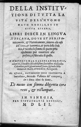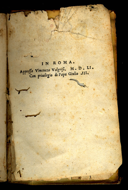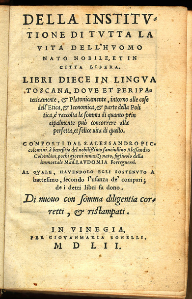 Alessandro Piccolomini (Siena: 1508 - 1579). L'Instrumento de la filosofia. Also, La prima parte della filosofia naturale. Roma: Vincenzo Valgrisi, 1551. Piccolomini published L'Instrumento de la filosofia and La prima parte della filosofia naturalle in one volume. Both works form part of Piccolomini's humanist educational program. In the preface to the Instrumento, Piccolomini declares his faith that people would learn to reason correctly if they were taught the rules of logic in their own native language; and in the dedication to pope Giulio III in La prima parte the author is aware of being the first vernacular writer to deal systematically with natural philosophy. Later, in 1557, he published his mayor contribution to science in the vernacular: Della grandezza della terra e dell' acqua, a treatise on the measurement of water and earth on the globe. Piccolomini published a dramatic play, L'Alessandro (1545), sonnets and many philosophical essays. His Copiosissima parafrase nel primo libro della Retorica d'Aristotele, a commented paraphrase of Aristotle's Rhetoric, and his Commento sulla Poetica (1575) increased his fame and moved Torquato Tasso to visit Siena and consult Piccolomini about Aristotle and his poetic theory. The volume on display is the first edition of L'Instrumento and La prima parte della filosofia naturalle (the second part was published in 1565), published by Vicenzo Vilgrisi in Rome, where he was active for three years (1549-51). Vilgrisi's major works were published in Venice between 1539 and 1572. |