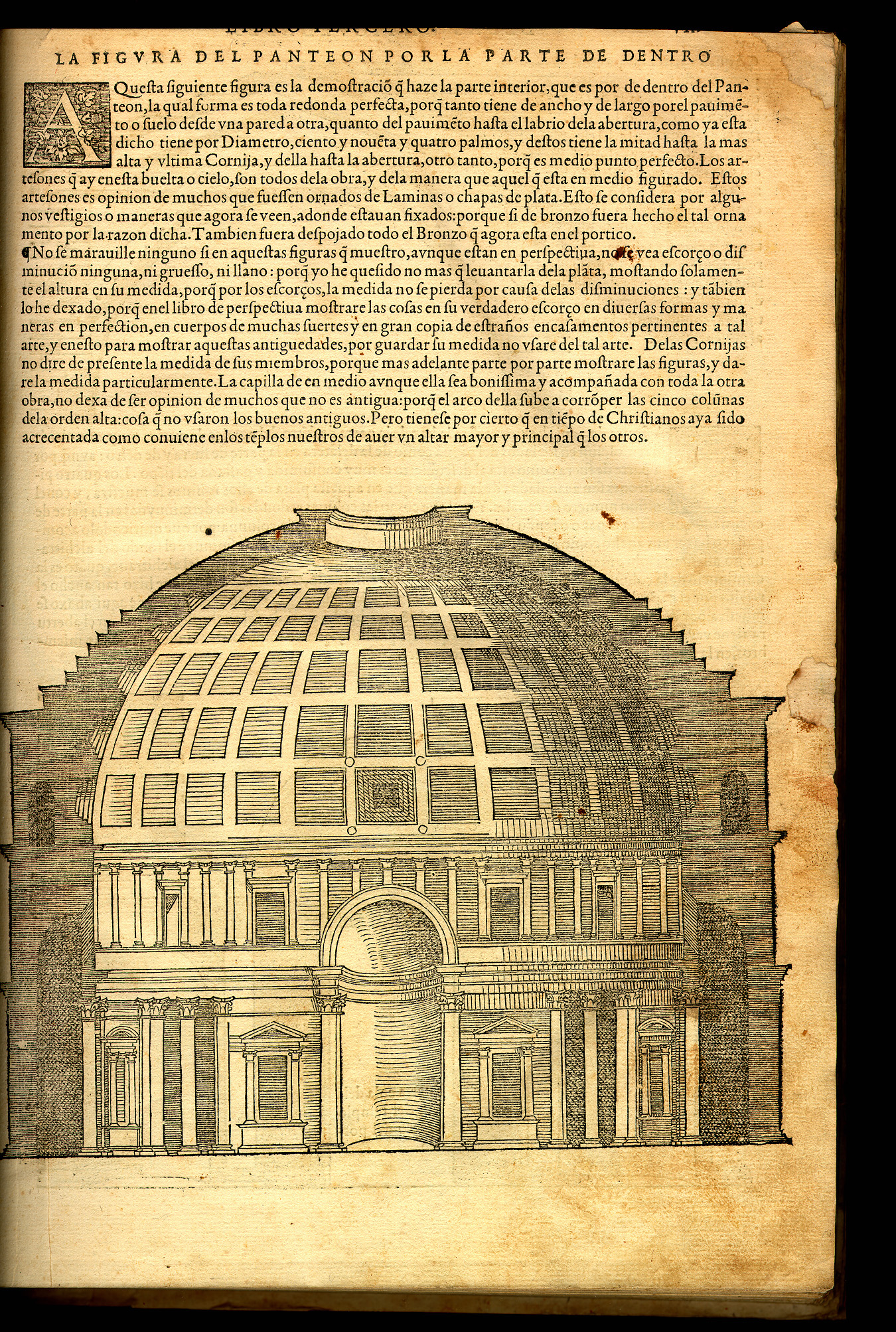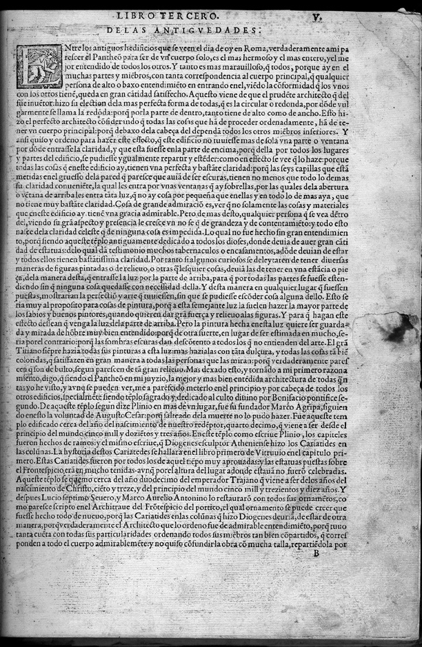 Sebastiano Serlio (Bologna, 1475 - Fontainebleau, 1554). Libro Tercero Y Quarto de Architectura. Toledo? : I. de Angela?, 1563. Serlio was a disciple of the architect Baldassare Peruzzi, one of the founders of Mannerist style. He studied Vitruvio's work and the monuments of antiquity and was the first to incorporate illustrations into an architectural handbook, using his own drawings as well as Peruzzi and Bramante's illustrations. His book entitled Tutte l'opere d'architettura, et prospectiva (1537-75) exerted great influence throughout Europe. The work of Sebastiano Serlio was translated into Spanish by the architect and sculpture Francisco Villalpando (Palencia?, ca. 1495 - Toledo, ca. 1561) in 1552 with the title Tercer y cuarto libro de architectura, and published in Toledo by Juan de Ayala with the same illustrations as the original Italian editions. This work is also known as "The books of antiquities," since Serlio drew plans of many ancient Italian buildings, such as the amphitheater of Rome. It was reprinted by the same house in 1563 (the edition on display here) and in 1572. The Durand Collection also contains Il primo [-secondo] libro d'architettura. Le premier [-second] livre d'architecture, a bilingual Italian and French edition published in 1545 in Paris and Venice by J. Barbé and Francesco Marcolini, respectively. |