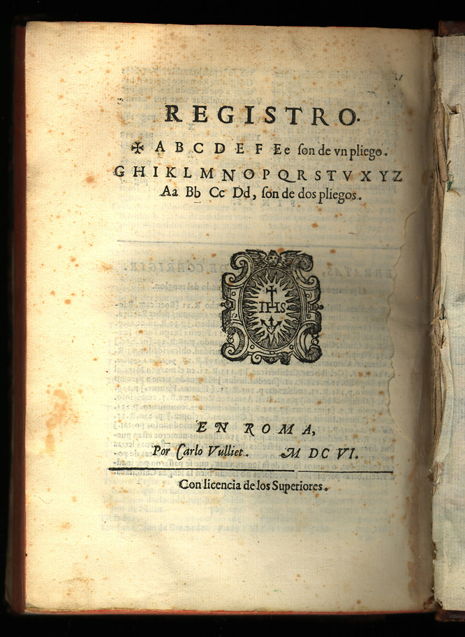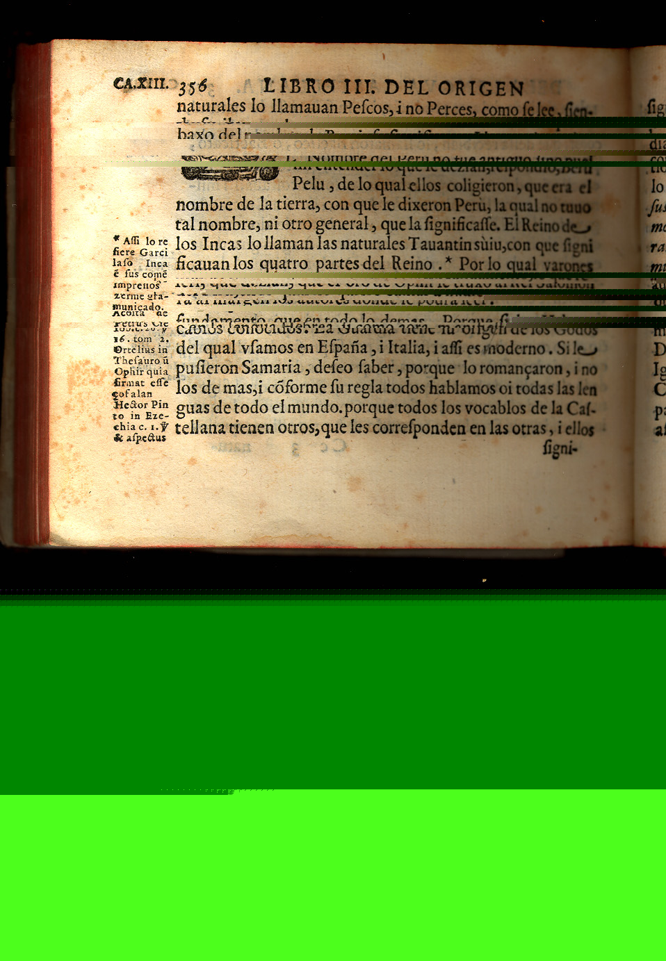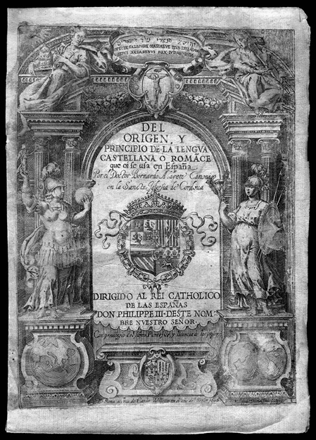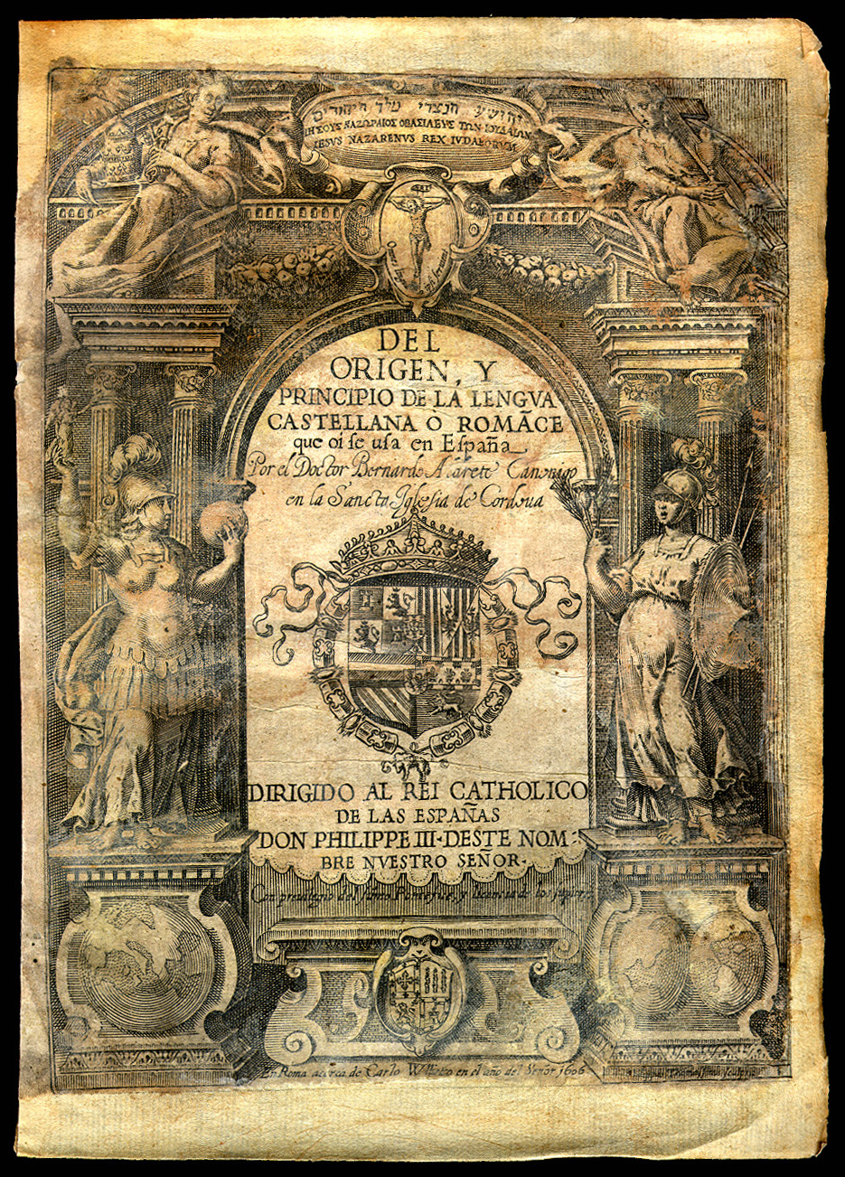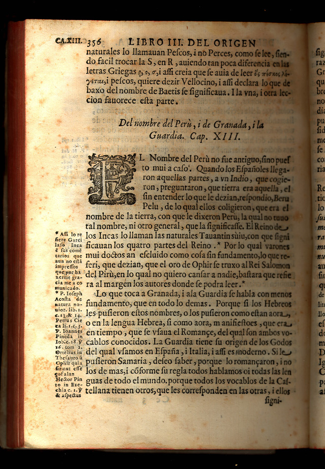 Bernardo Aldrete. Del Origen, y Principio de la Lengua Castellana o Roma[n]ce. Roma: Carlo Vulliet, 1606. Bernardo de Aldrete, was a Spanish humanist, antiquarian, linguist and friend of Garcilaso Inca de la Vega in Córdoba. He studied Theology and the Humanities in Granada and was learned in classical and modern languages, such as Hebrew, Arabic, Chaldean, Italian and French. His important lexicographical work Del origen y principio de la lengua castellana was later used in the first edition of the Diccionario de la lengua castellana, in 1726. An entry on p. 356 quotes Garcilaso regarding the origin of the name "Peru" and clarifies in a printed marginal annotation that Aldrete's source was the as yet unpublished Royal Commentaries. |