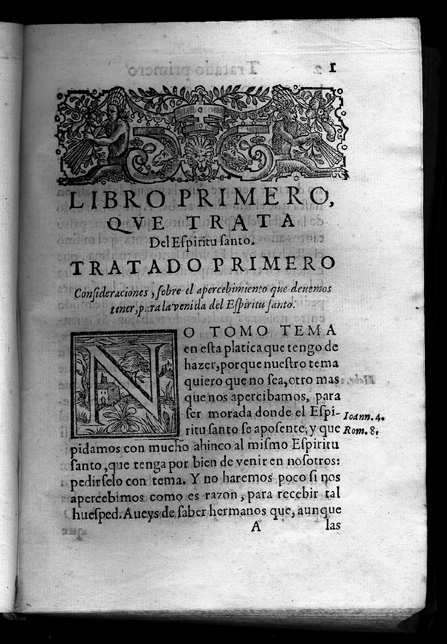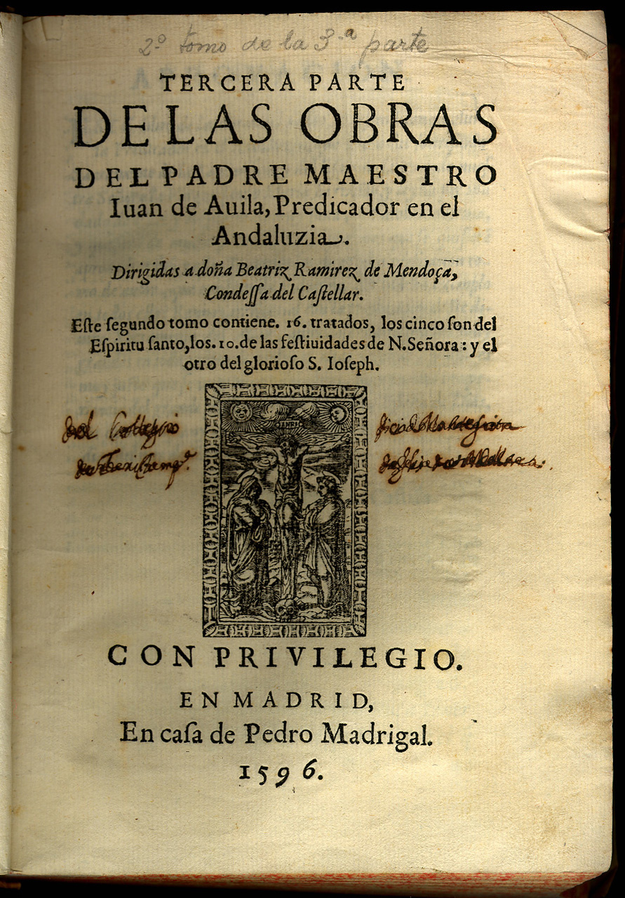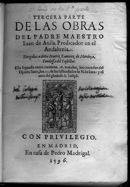Juan de Avila. Tercera Parte de las Obras Del Padre Maestro Iuan de Auila. (2nd vol. of the 3rd part). Madrid: En casa de Pedro Madrigal, 1596. Juan de Avila was one of the most important ascetic writers of this period and was beatified by Pope Leo XIII. His works are clear and lucid models of prose writing. Juan became known as "el Maestro." and was the teacher of one of the most prolific authors of the century, Luis de Granada. Juan was also abbot of the monastery of Alcalá de la Real (Jaén) and offered himself as bishop of Tlaxcala (Mexico). He was persuaded to stay in Spain doing missionary work in Andalucia. The Primera y Segunda parte de las obras of Juan de Avila were printed in 1595, in Madrid by Luis Sánchez. The Durand Collection holds the second volume of the Tercera parte de las Obras, which deals with the Holy Sacrament of the Eucharist, the Holy Spirit and the Virgin Mary. |