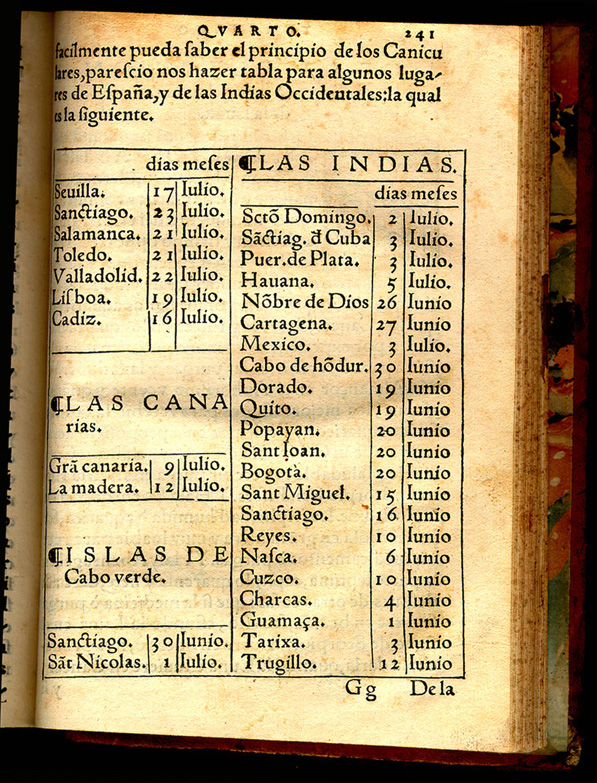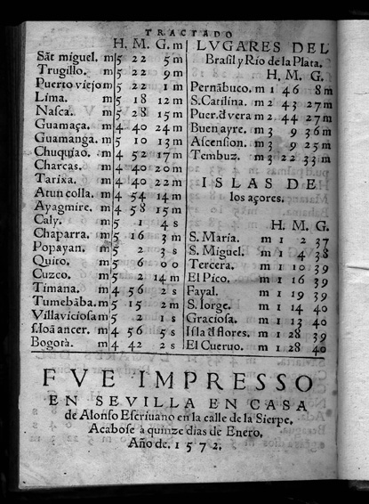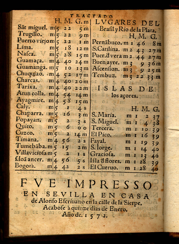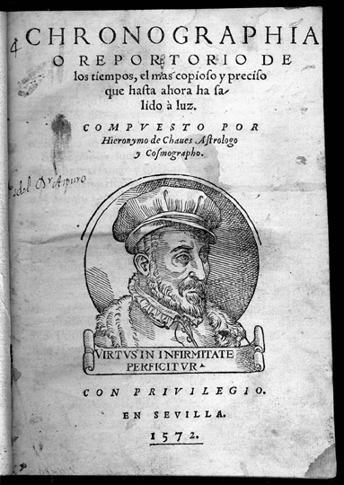Hieronymo de Chaves. Chronographia o Reportorio de los tiempos.... Sevilla: Casa de Alonso Escriuano, 1572. Chaves was a mathematician, cosmographer and poet. He held the chair of Cosmography in the Casa de la Contratación in Seville, repository for all official documents related to the Spanish possessions in America. Among Chaves' publications are a Tratado de la Sphera (1545) and maps of Seville and America. The Chronographia is Chaves' translation of the astronomical encyclopedia of Johannes de Sacro Bosco (John of Holywood), to which Chaves added a chronological account of notable incidents from Spanish history. |