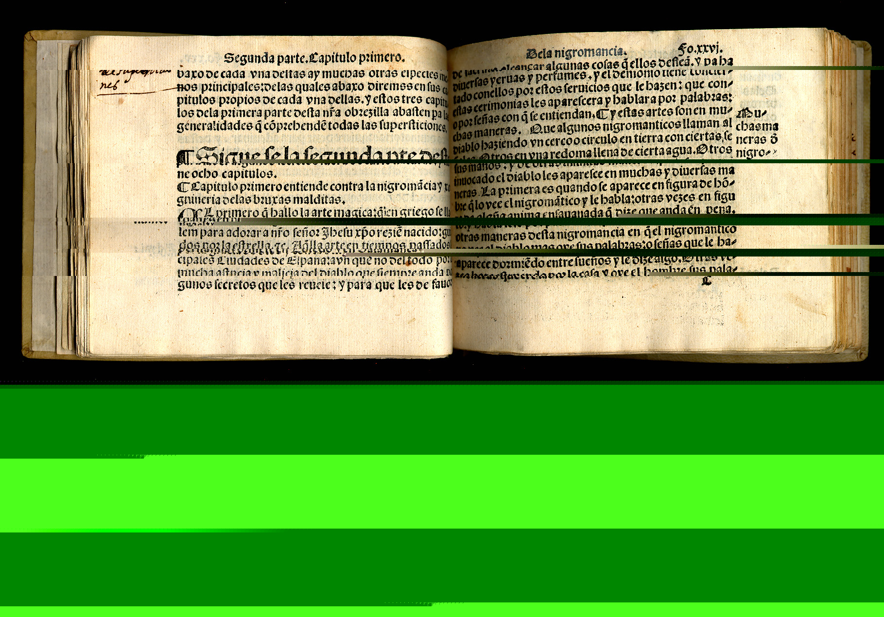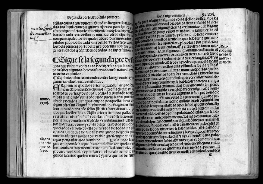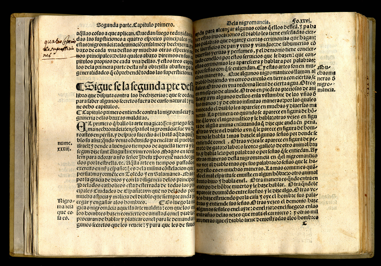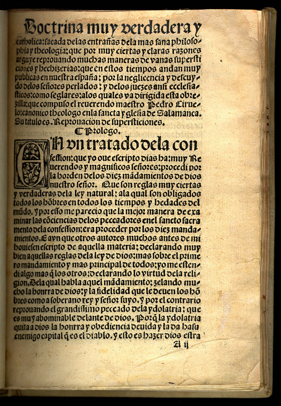 Pedro Ciruelo. Reprouacion de supersticiones. [Salamanca]: [Pedro de Castro], ca. 1539. Pedro Ciruelo studied in the Colegio de San Idelfonso in Alcalá (by 1510) and then in Salamanca. He received his doctoral degree from Paris. He wrote treatises on logic, mathematics, philosophy, religion and popular beliefs. His work on display here, the Reprobación de las supersticiones ("Condemnation of superstitions") is sometimes confused with a witchcraft manual. It is in fact a religious treatise against magic and the divinatory arts. |