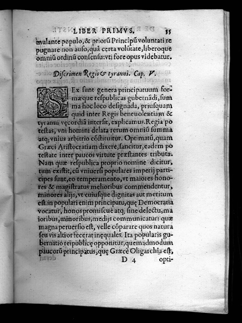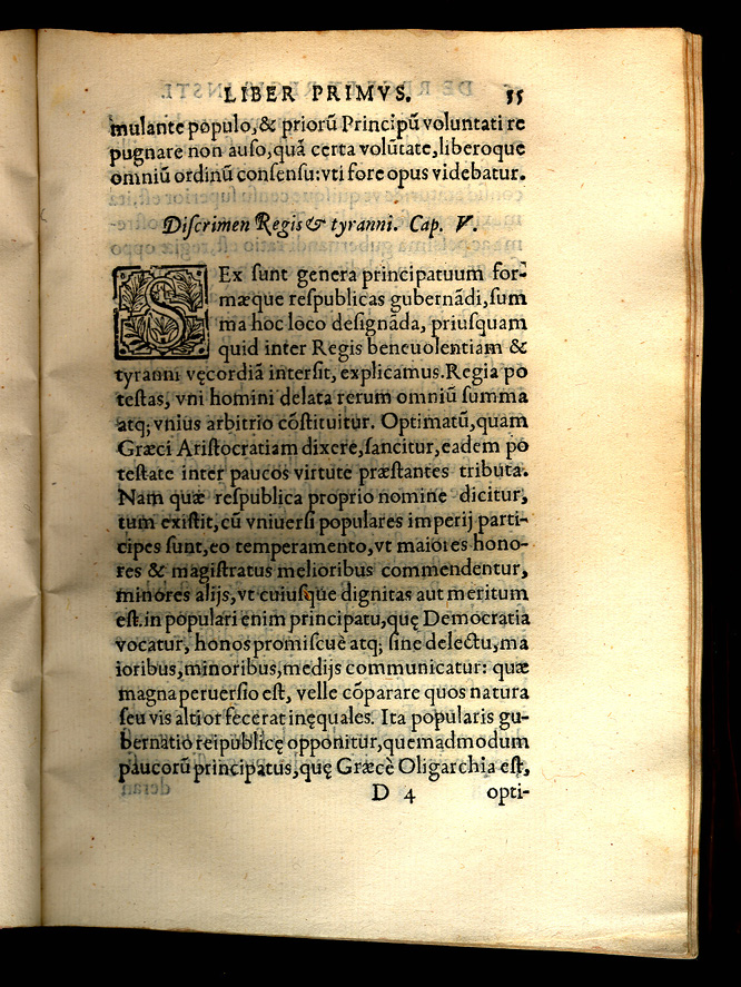 Joannes de Mariana. De Rege et Regis Institutione. Toleti: Apud Petrum Rodericum, 1599. Juan de Mariana was a Spanish Jesuit, historian and philosopher as well as author of the Historiae de rebus Hispaniae (1592), a history of Spain that combines legend, anecdote and history. Father Mariana taught Theology in Rome, Sicily and Paris. In his controversial book De rege et regis institutione ("The king and the education of the king") he argued that if the king does not follow religion and civil law it is justifiable to overthrow him. Like Fox Morcillo he discusses the philosophy of kingship but whereas Morcillo based his discussions on the ancients (especially Plato and Aristotle) Mariana relied on the Bible and church doctrine. Both volumes discuss the difference between a true king and a tyrant. The volume on display is the first edition of De Rege. |