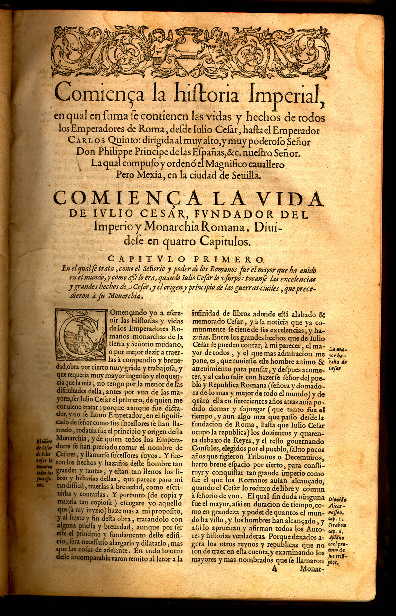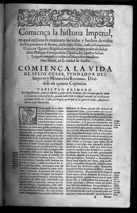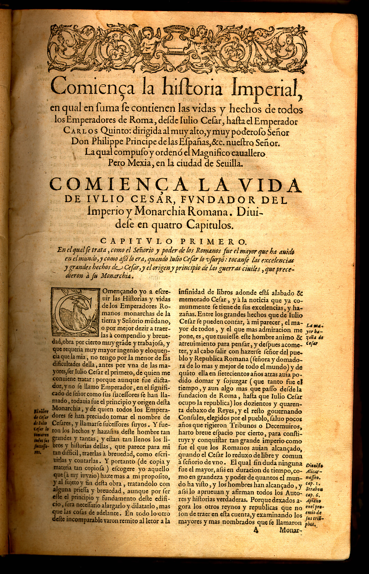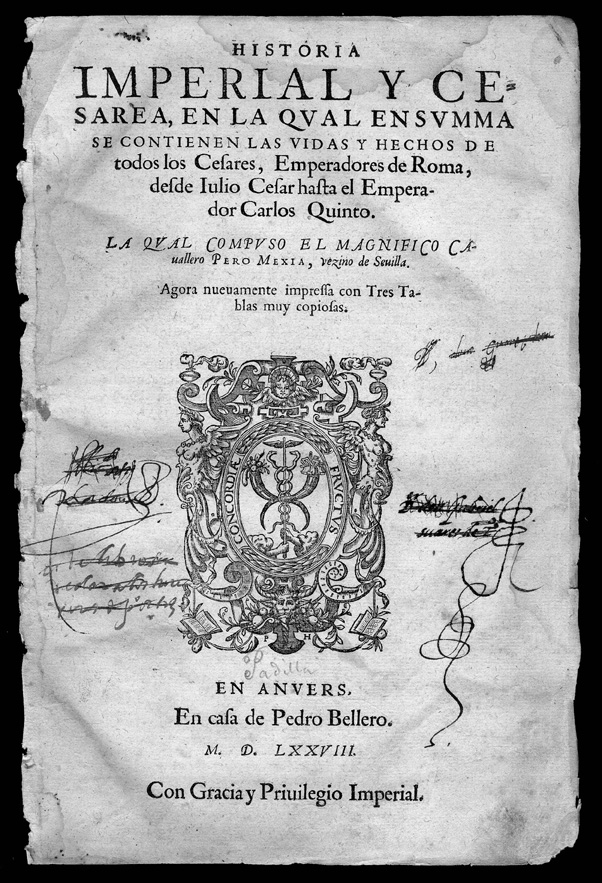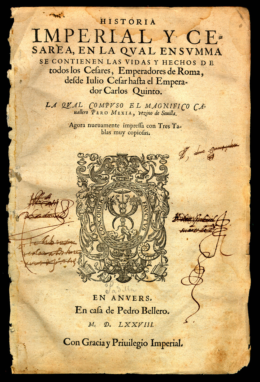 Pero de Mexia. Historia Imperial y Cesarea. Anvers: Casa de Pedro Bellero, 1578. Mexia was a famous Spanish poet and historian who studied in both Seville and Salamanca. His friendship with Hernando Columbus, son of Christopher, encouraged him to write historical and literary studies. He was appointed royal chronicler of Charles V in 1548. The Historia Imperial, the first general history written in Spanish, is a collection of biographies of Emperors and was very popular. It was frequently reprinted and translated. Mexia also wrote a miscellaneous work called the Silva de varia leccion which contains brief notes on a variety of themes and was very popular in Spain and throughout Europe. |