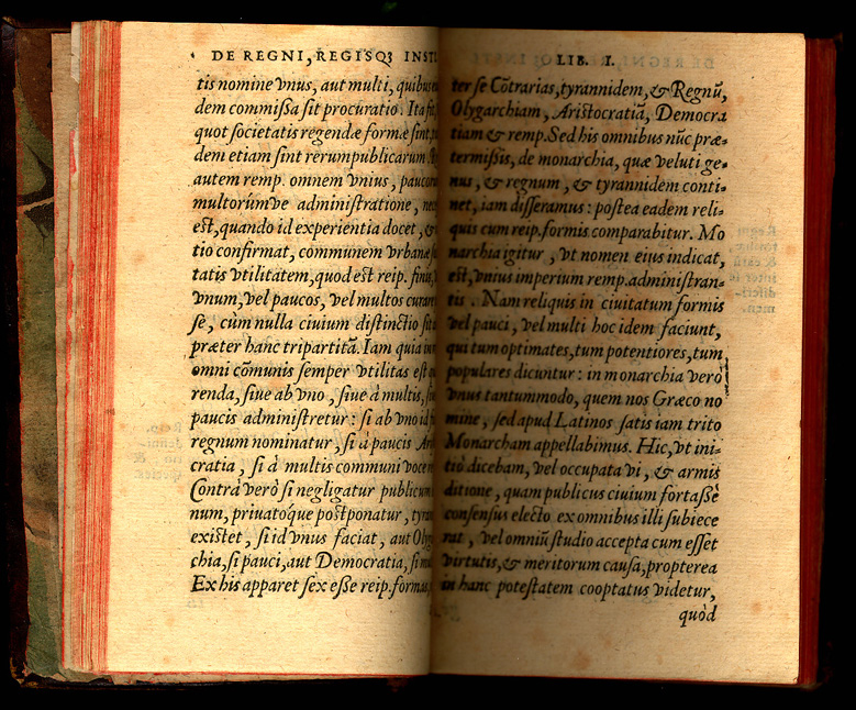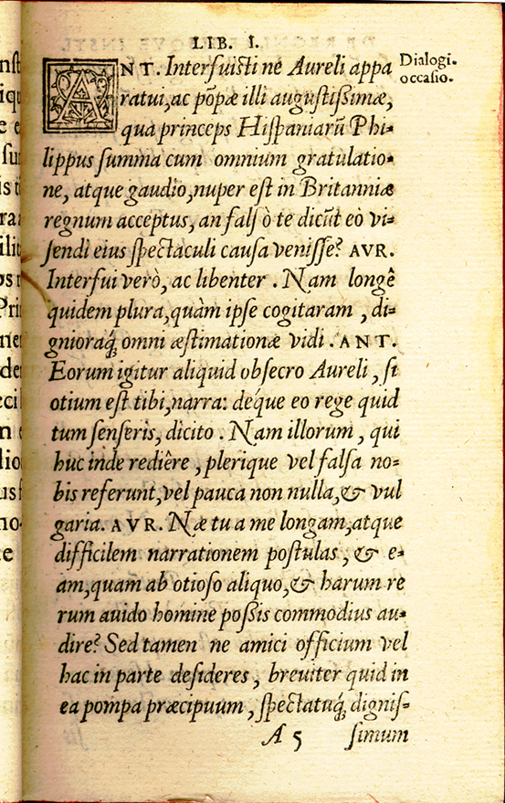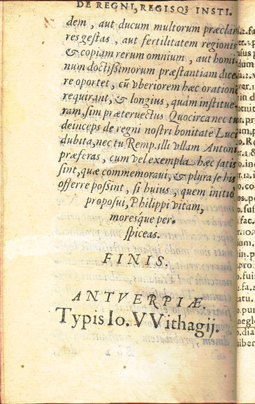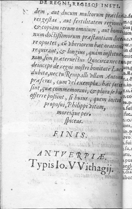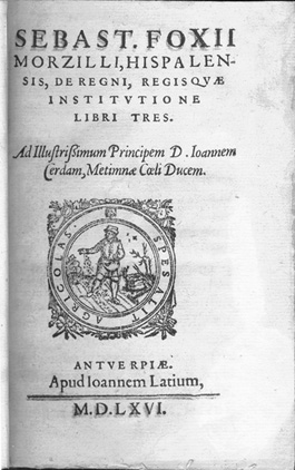 Sebastianus Foxius Morzillus. De Regni, Regis Quae Institutione libri tres. Antverpiae: Apud Ioannem Latium, 1566. Fox Morcillo was a Spanish philosopher who studied at the universities in Seville, Alcalá and Louvain (Belgium). He wrote literary treatises on the writing of history as well as commentaries on Plato, Aristotle and political matters. The work on display is a philosophical discussion on kingship rather than a history on individual kings. |