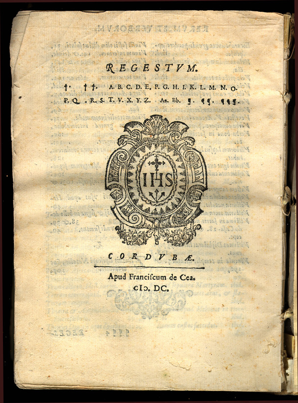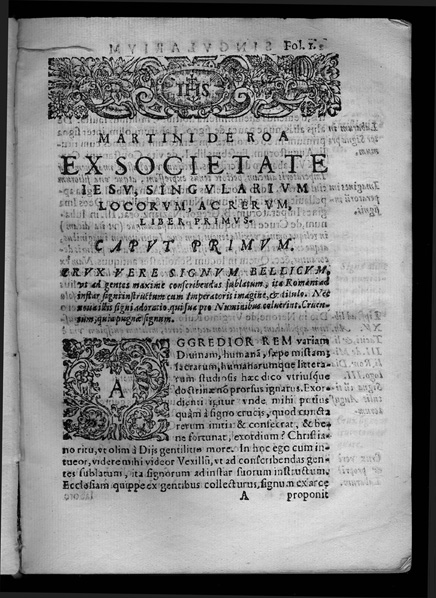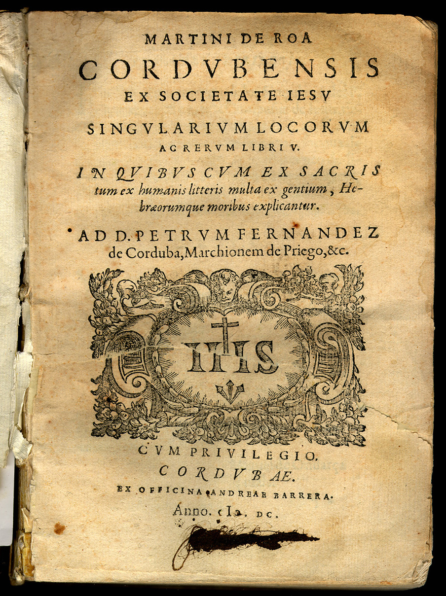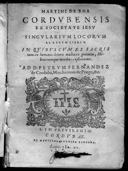 Martin de Roa. Singularium locorum, ac rerum, libri V. Cordvbae: Andreae Barrera, 1600. [2nd part at Cordvbae: Apud Franciscum de Cea, 1600]. Roa was a Spanish Jesuit, historian and exegete. He was a professor of Grammar, Humanities and Rhetoric and later chair of Sacred Scriptures in Cordoba. He published several works on grammar, local history and the antiquities of Málaga and Écija in Spain. The Durand Collection holds the first edition of the Singularium, a religious book about important quotations in the Scriptures and in profane letters. It is bound with the De die natali sacro, printed in the same year by Francisco de Cea. The De die natali is actually book 6 of the Singularum. |