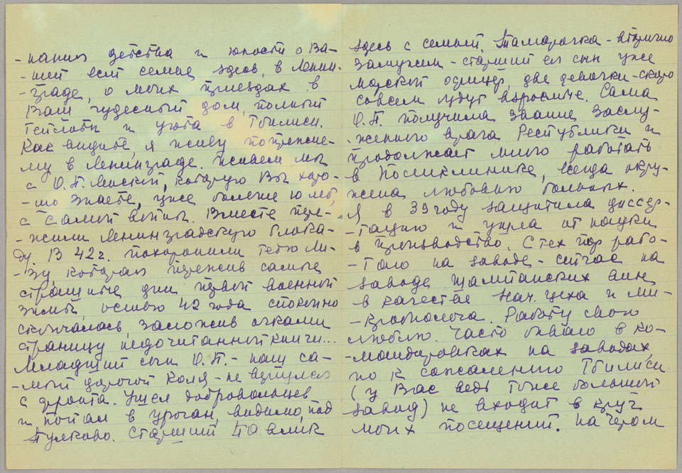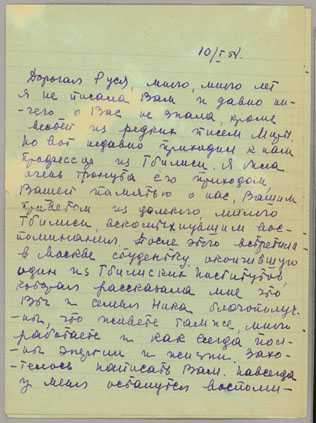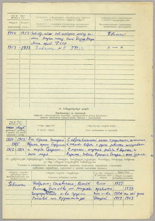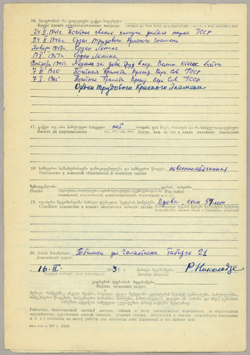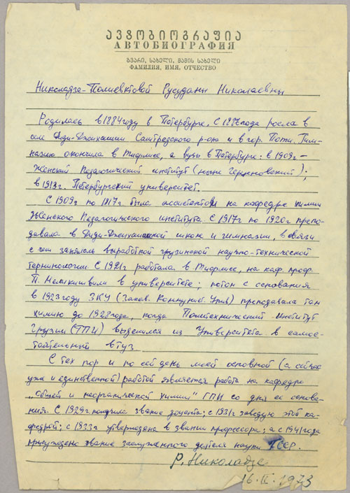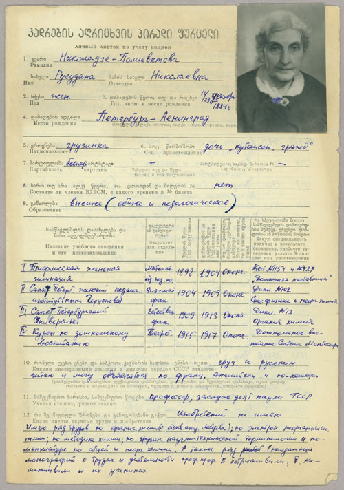 Rusudana’s son Nikolai became a prominent nuclear physicist and reportedly worked for the Soviet atomic bomb project under Kurchatov in the 1940s. He returned to Tbilisi around 1970 to be with his elderly mother and taught physics at the University. Rusudana’s father and younger siblings all passed away prior to the Second World War. After her husband’s death in 1942, she became the sole custodian of the family archive and dedicated her life to preserving their legacy and papers.