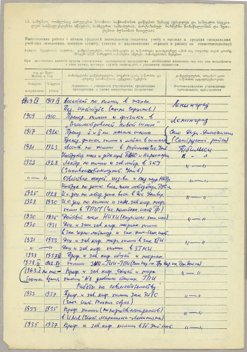 In July 1917, Rusudana and her toddler son returned to Didi-Dzhikhaishi, where she was among the founders of the local gymnasium and where she taught until 1920. She then moved to Tbilisi and until her retirement in the early 1970s worked at several institutions of higher education, beginning as a researcher and reaching, in 1933, the rank of Professor and Chair of the chemistry departments at Tbilisi State Pedagogical and Polytechnic Institutes. Rusudana was a prolific and talented writer, publishing scholarly works on organic and inorganic chemistry, chemistry methods, and Georgian chemistry terminology. She also completed two (unpublished) monographs on the life and works of famous Georgian chemists, Professors V. Petriashvili and P. Melikishvili, long (unpublished) memoirs on her St. Petersburg mentors, and accounts of her prerevolutionary life in both Georgian and Russian.