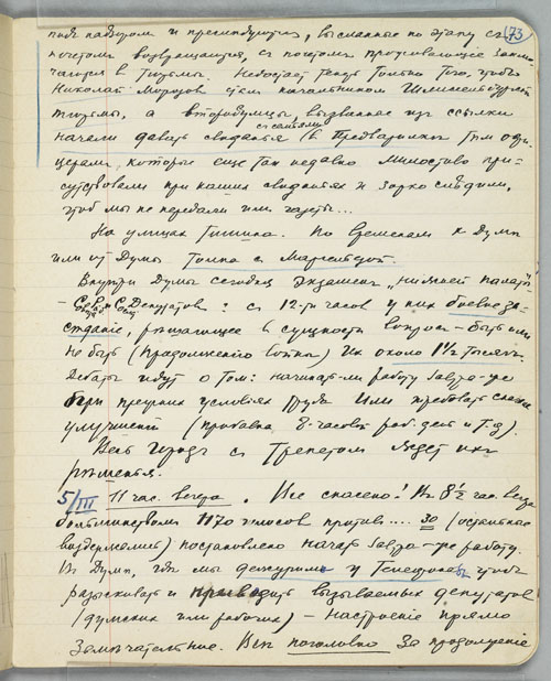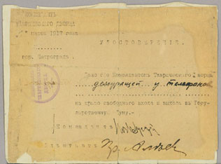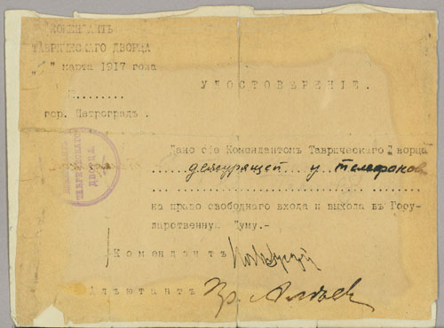 Considering the Left-leaning political orientation of the recently formed Polievktov-Nikoladze clan, it is hardly surprising that they greeted the news of the February Revolution with enthusiasm. Rusudana recorded in her diary that her parents’ reaction to the demise of the old order was even more jubilant and euphoric than her own or that of her younger sister Tamara (1892-1939), a recent graduate of the Women’s Pedagogical Institute. Within days, the Nikoladze sisters offered their services to the newly formed Petrograd Soviet and in the following weeks they worked eight-hour shifts every day inside the Tauride Palace as telephone operators on the lines designated for the Soviet’s leaders. (See Rusudana’s entry pass to the Duma exhibited). The sisters also played a major part in the work of the Interview (Polievktov) Commission. Rusudana’s careful, contemporaneous diary of her experiences during the February Revolution is also here on display.