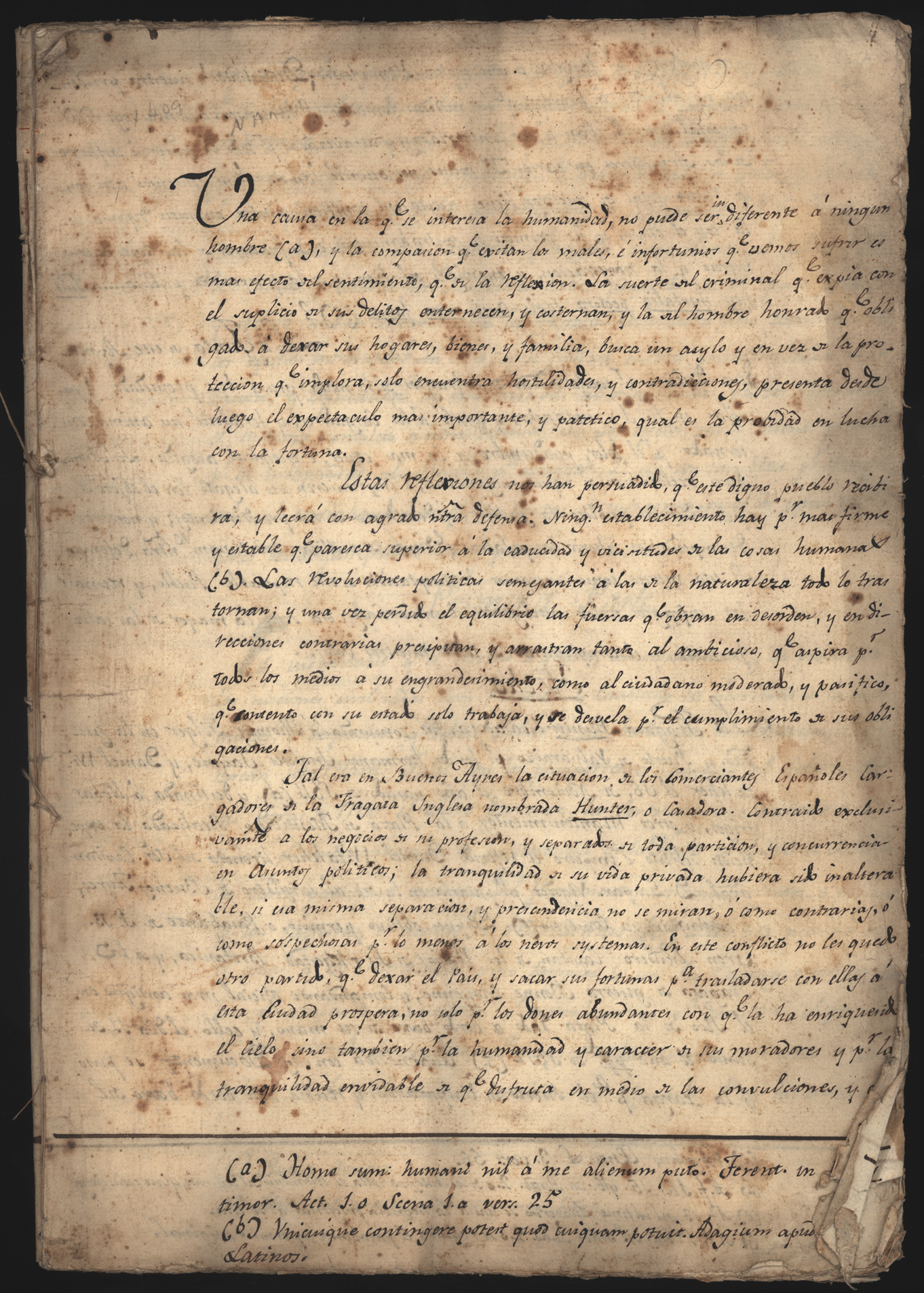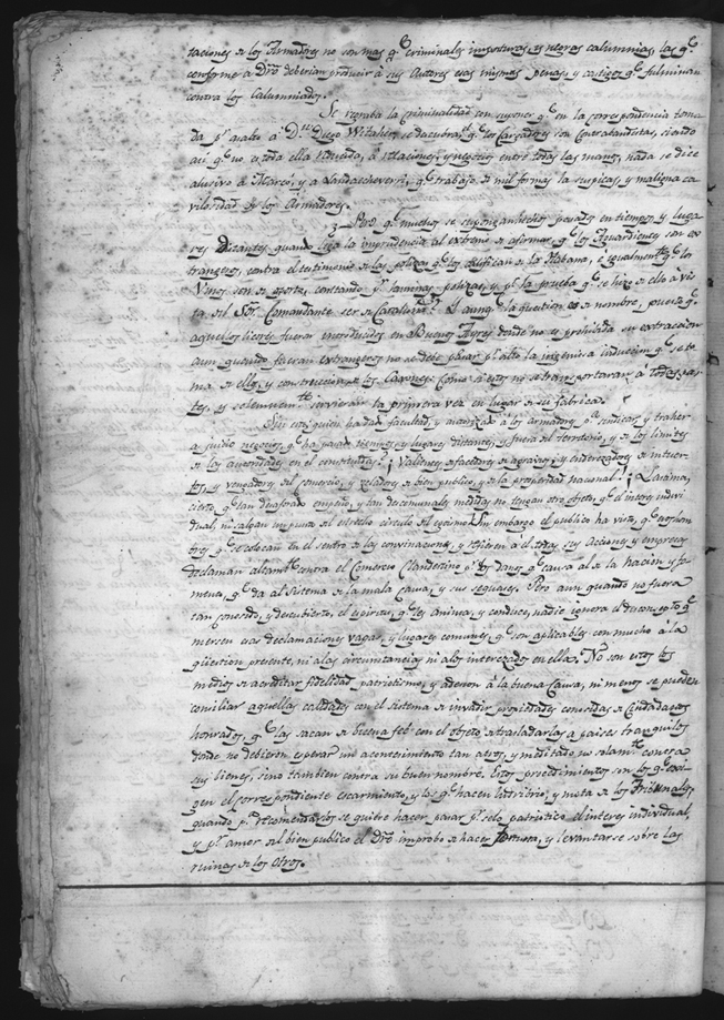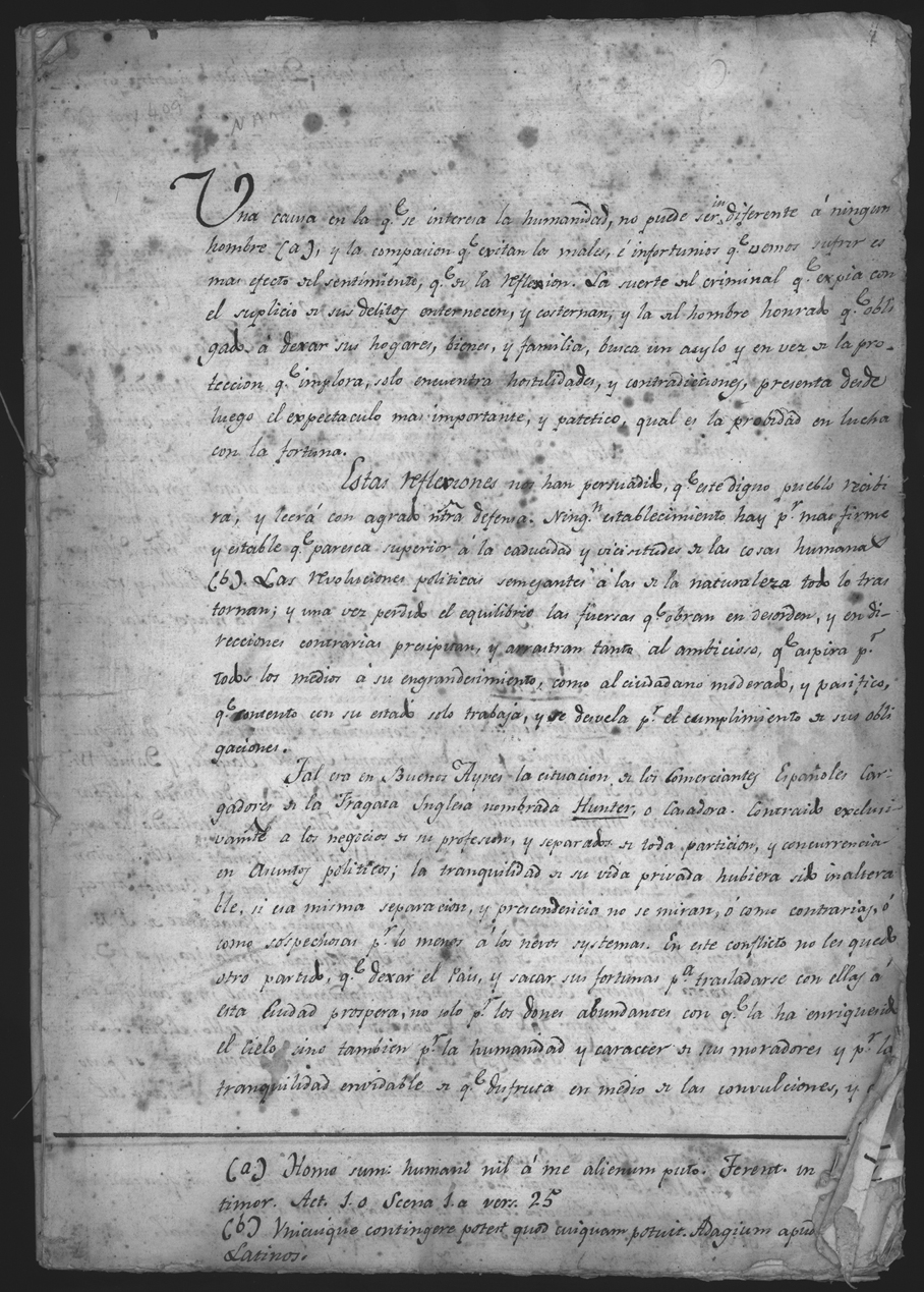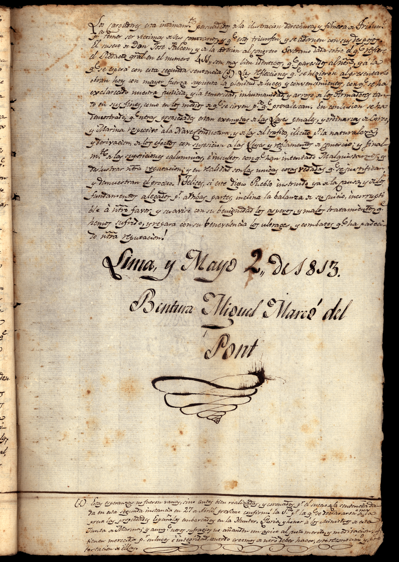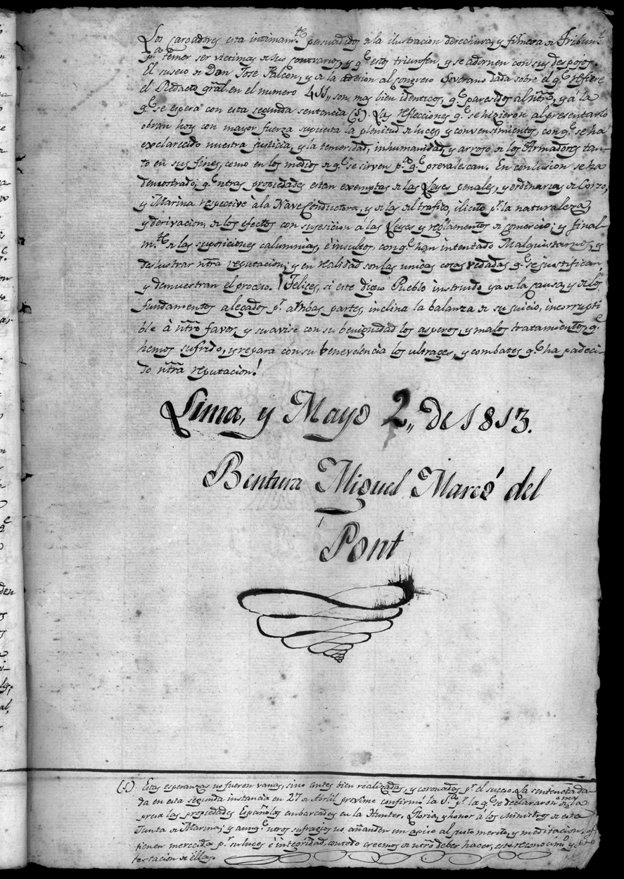 The document is the defense by Miguel Marcó del Pont against the Peruvian Viceroyaltys accusation that the "Fragata Hunter" had violated the Spanish commercial trade route from Montevideo to Valparaíso. The Spanish "Fragata Cantabria" detained the Hunter in near Valparaíso. The Hunter had a license, authorized by the English, the French and by Captain General of Montevideo, to carry goods to Valparaíso from Montevideo, since Buenos Aires was closed to commerce for its insurrection against the Spanish. The authorities of England, France and Montevideo are charged responsible for the actions. Description created by Margarita Hernandez.