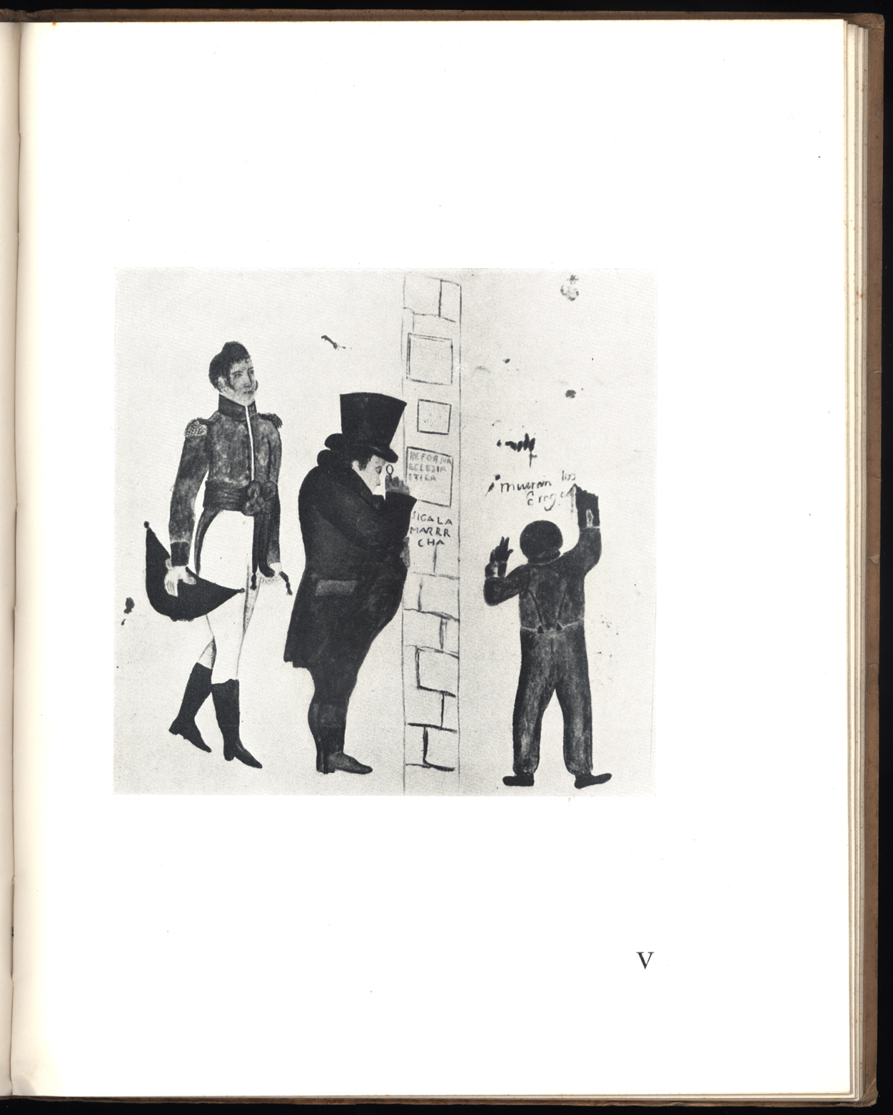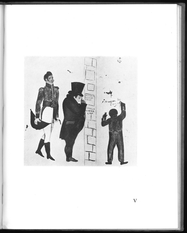 This caricature shows Bernardino Rivadavia peering at a mulatto who is writing "Death to the heretics" on a wall. Rivadavia is standing next to an official posting stating "Reform the church Continue the march". Behind Rivadavia is the governor of the Buenos Aires province.