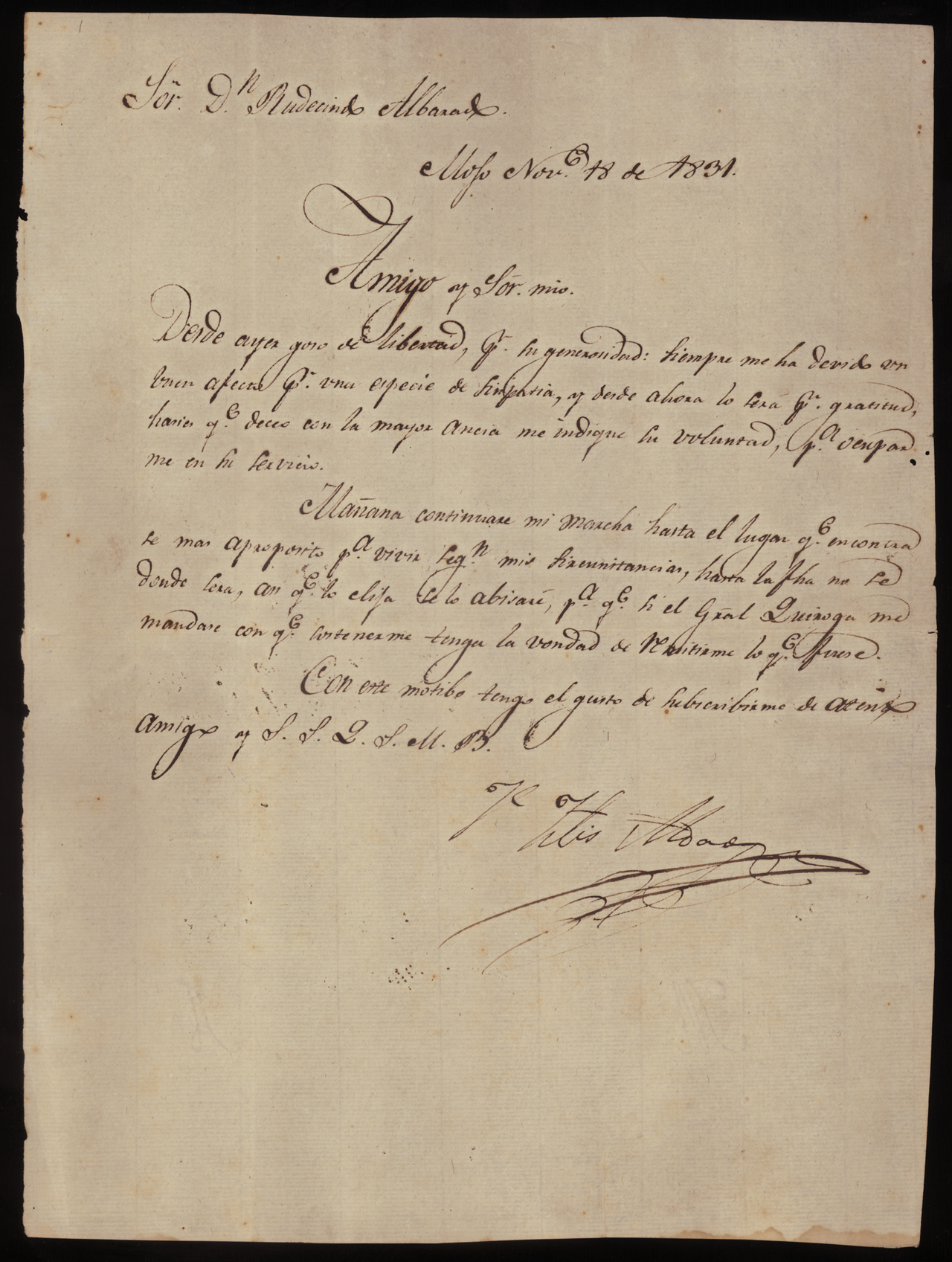Aldao writes to D. Rudecindo Albarado, who helped free him from Unitario imprisonment under General José María Paz. This letter, written from Mojo, Bolivia, thanks Albarado for his help and places himself at his service. He awaits word from Facundo Quiroga on what to do next.