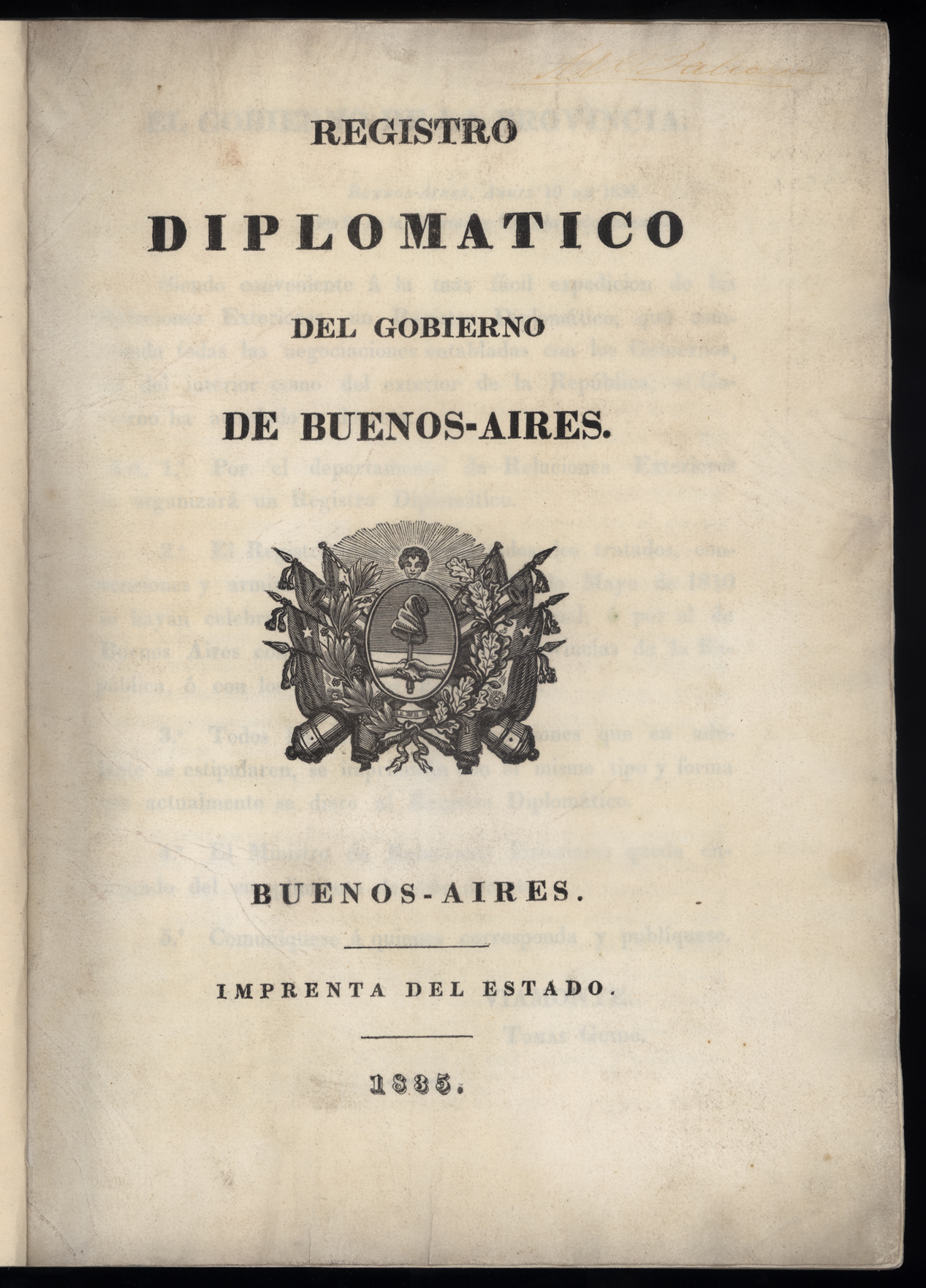 The Registro diplomatico del gobierno de Buenos Aires brings together treaties signed between provinces following independence in 1810. For example, the 1820 treaty signed between Santa Fe and Buenos Aires ends the fighting between the two and promises to remove barriers to peaceful co-existence. The documents underscore each provinces autonomy, treating their association with other provinces as foreign relations.