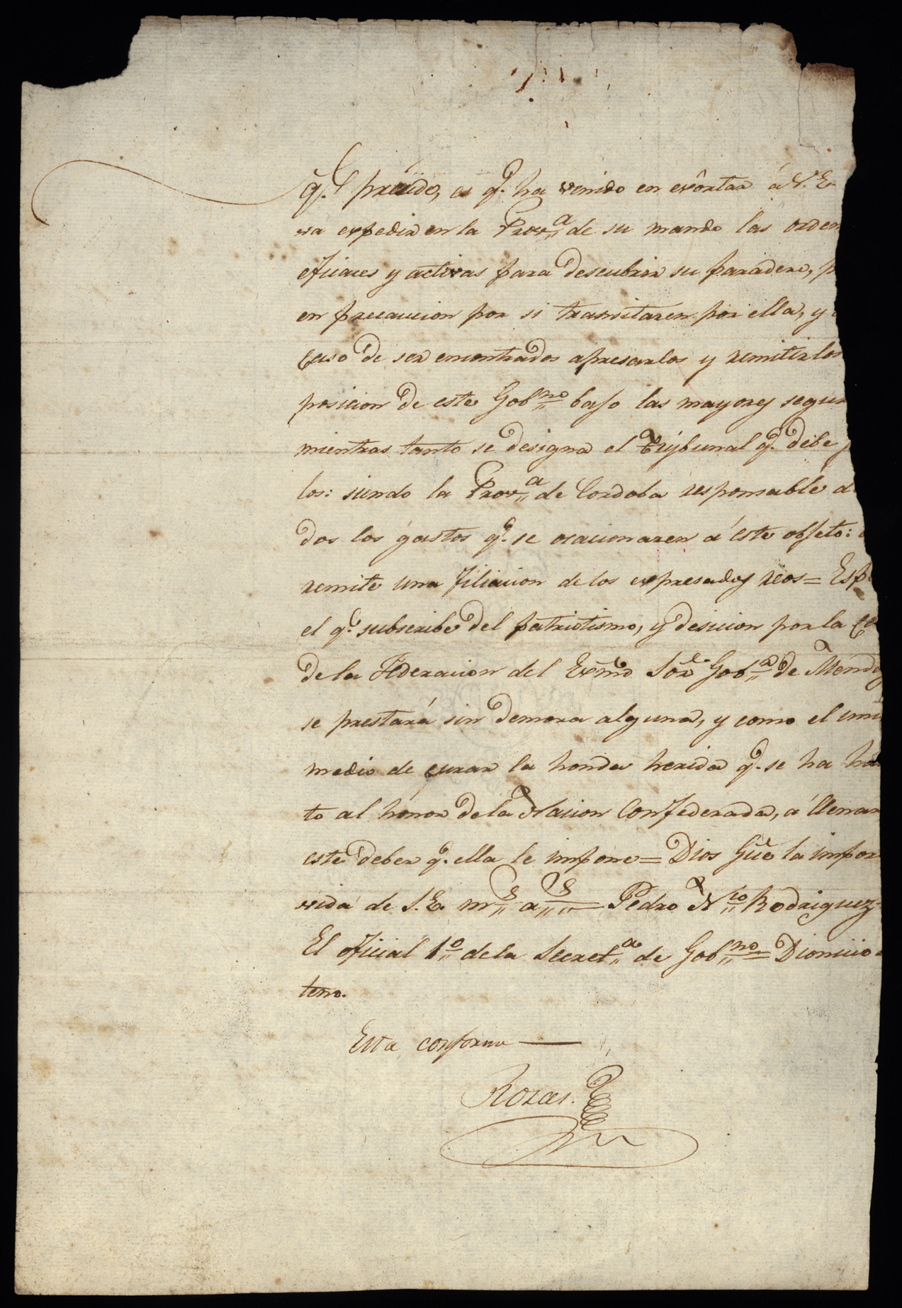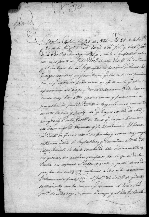 Rosas informs the governor of Mendoza that the Reynafé brothers are being accused of assassinating Facundo. Rosas believes that Don Antonio Reynafé has left the city (Córdoba) and probably the Province. He is afraid the other two brothers (Francisco and Guillermo) will also leave. Rosas urges the governor to join the Federalist cause by searching for the Reynafé brothers within his Province. If they are found, he must have them sent to Córdoba, where they will be prosecuted. All the expenses are to be covered by the government of Córdoba. Rosas firmly asks the governor of Mendoza to cooperate, for this assassination has deeply wounded the honor of the Confederation. Description by Margarita Hernández.