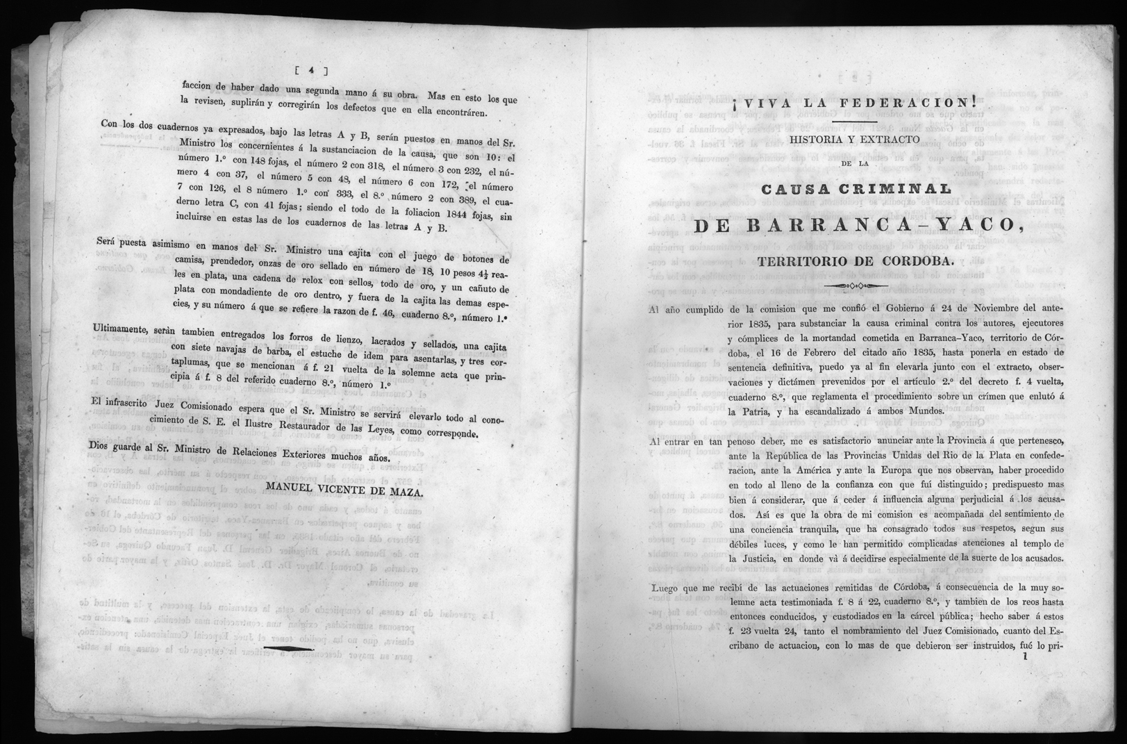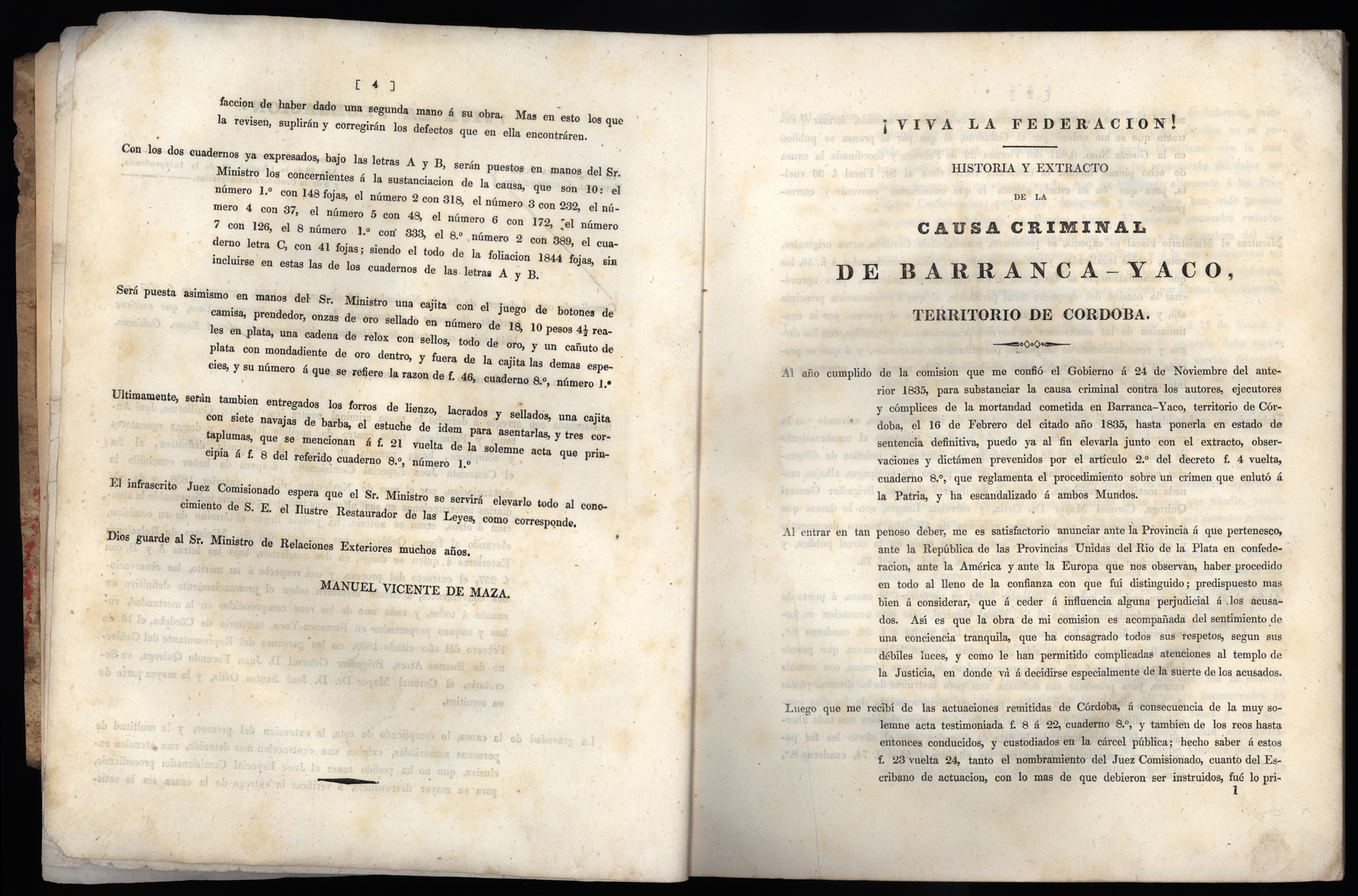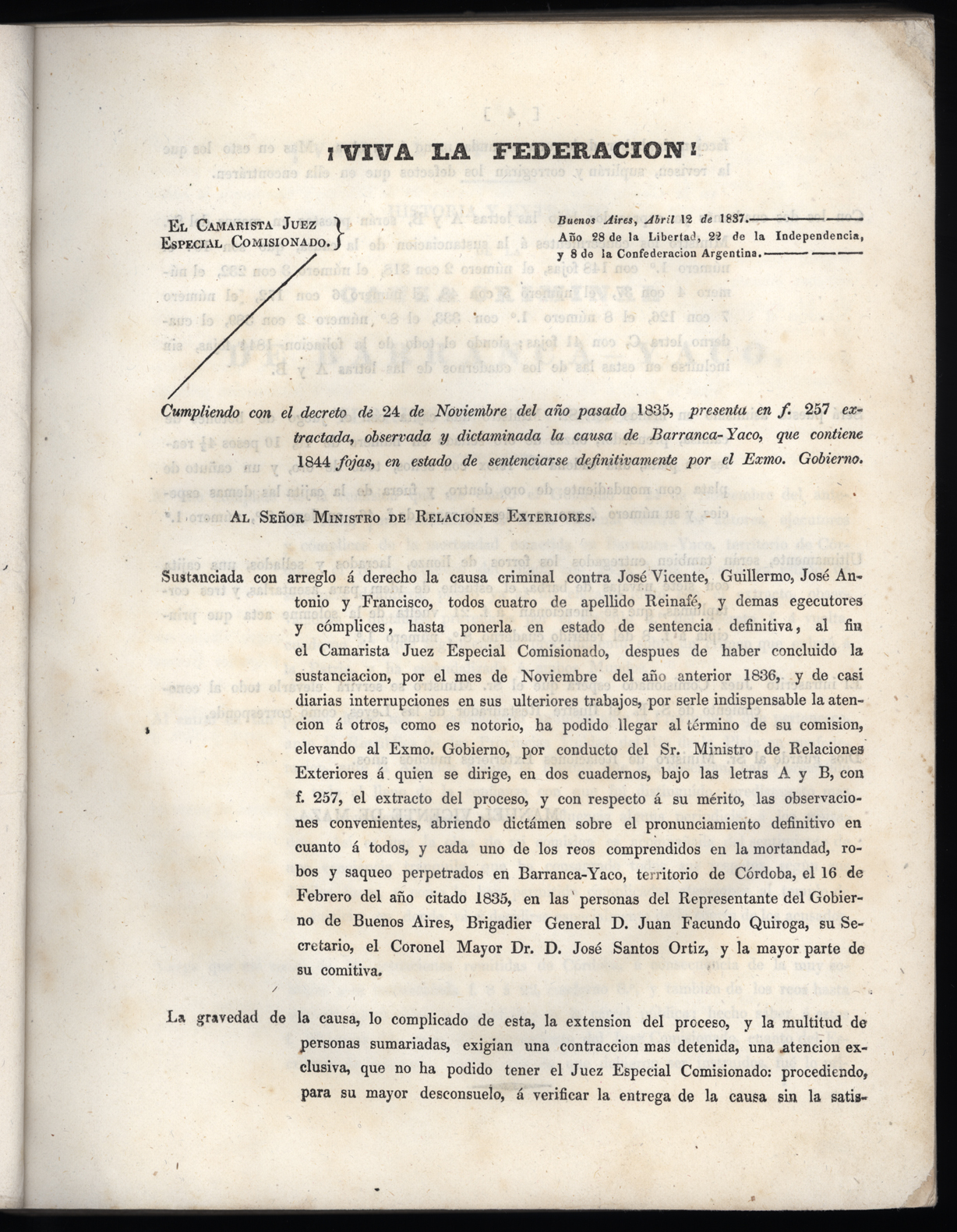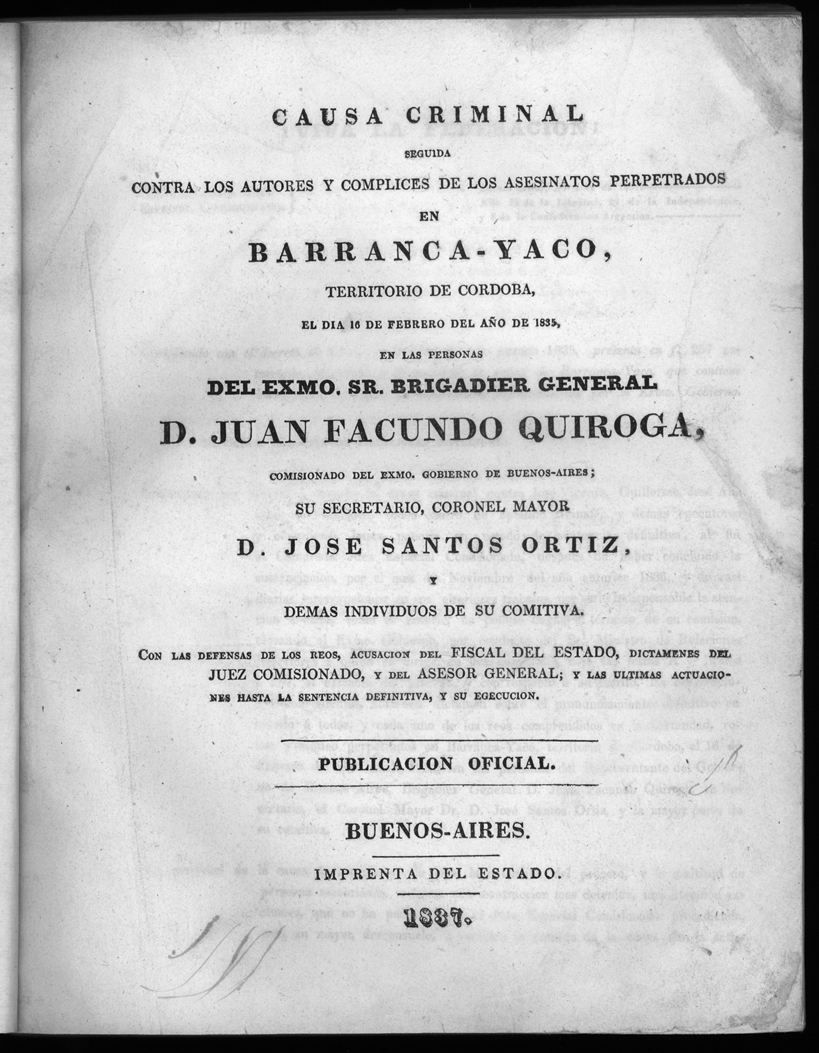 Causa criminal seguida contra los aútores y complices de los asesinatos perpetrados en Barranca-Yaco, Territorio de Cordoba, el dia 16 de febrero del año de 1835, en las personas del Exmo. Sr. Brigadier General D. Juan Facundo Quiroga, comisionado del exmo. gobierno de Buenos-Aires; su secretario, Coronel Mayor D. José Santos Ortíz, y demas individuos de su comitiva : con las defensas de los reos, acusación del Fiscal del Estado, dictamenes del Juez Comisionado, y del Asesor General, y las ultimas actuaciones hasta la sentencia definitiva, y su egecución.