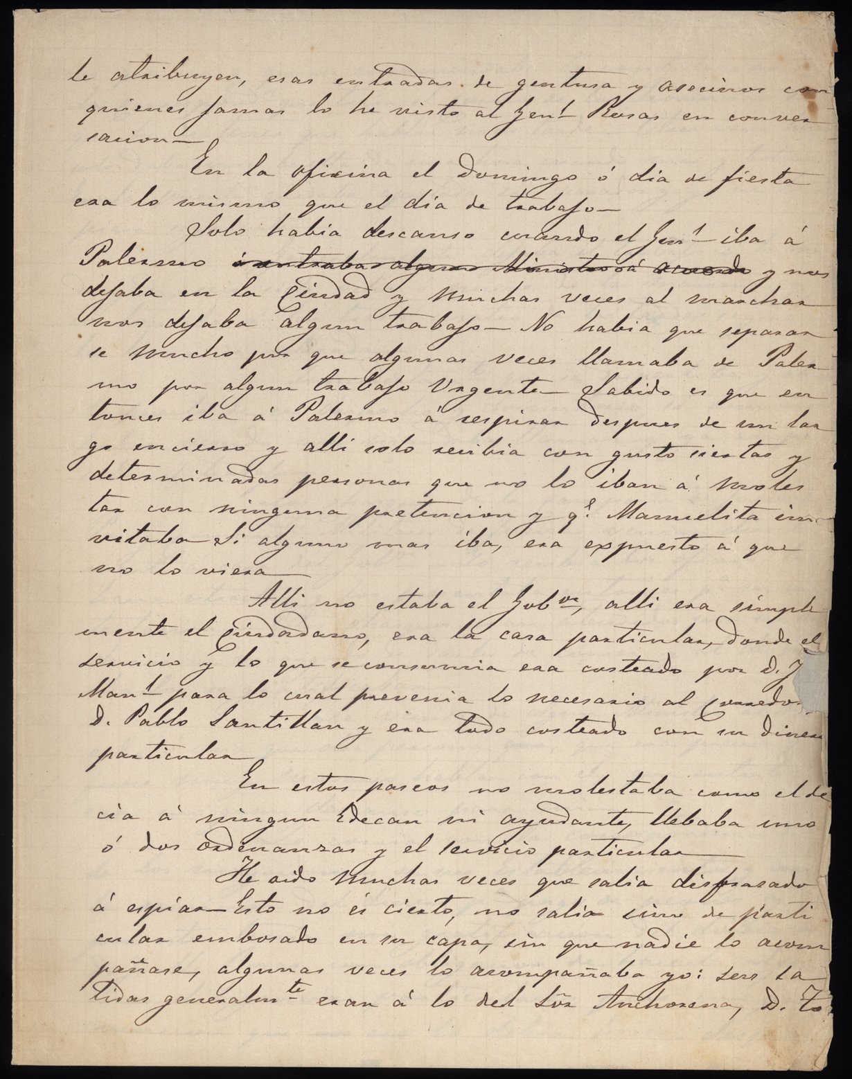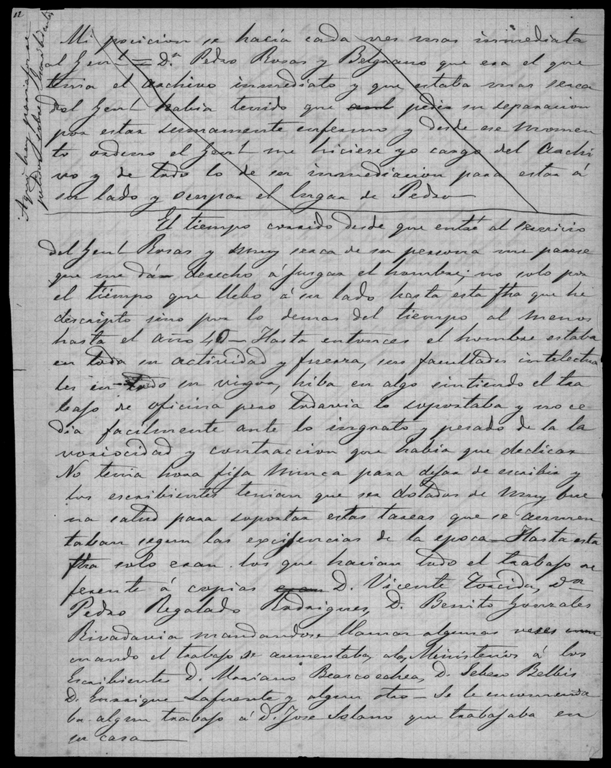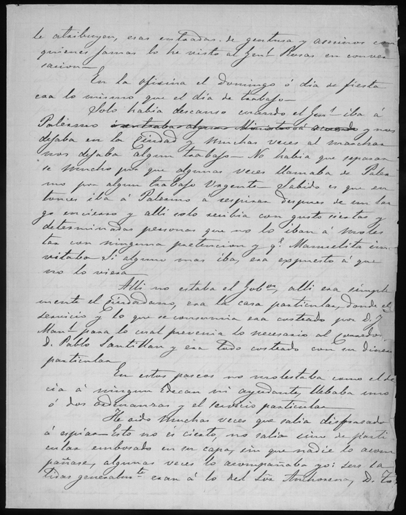 On the pages shown here, Reyes describes working for Rosas. Each secretary must be in good health to keep up with Rosas frenetic schedule of working for several hours every day and usually into the early morning hours. Sundays and holidays meant little to Rosas, he worked through them. When Rosas traveled to his ranch, he often required a scribe to travel with him. If a scribe did not travel with him, he regularly requested that a scribe join him. This important memoir gives us a view of Rosas style of governing on a day-to-day basis.