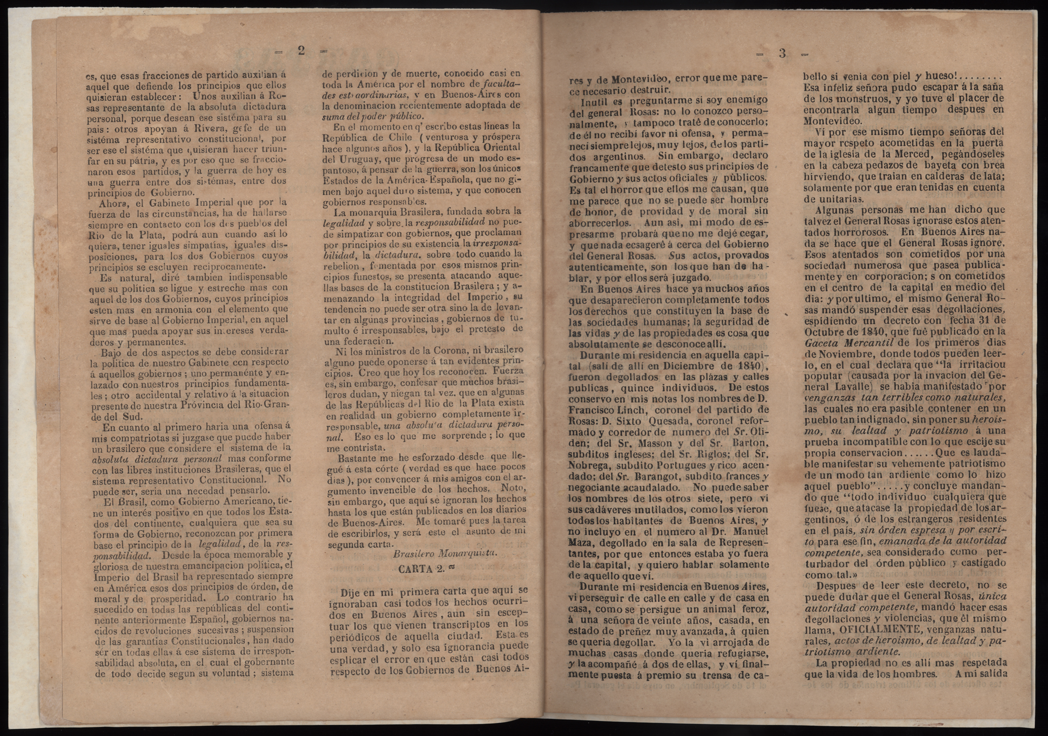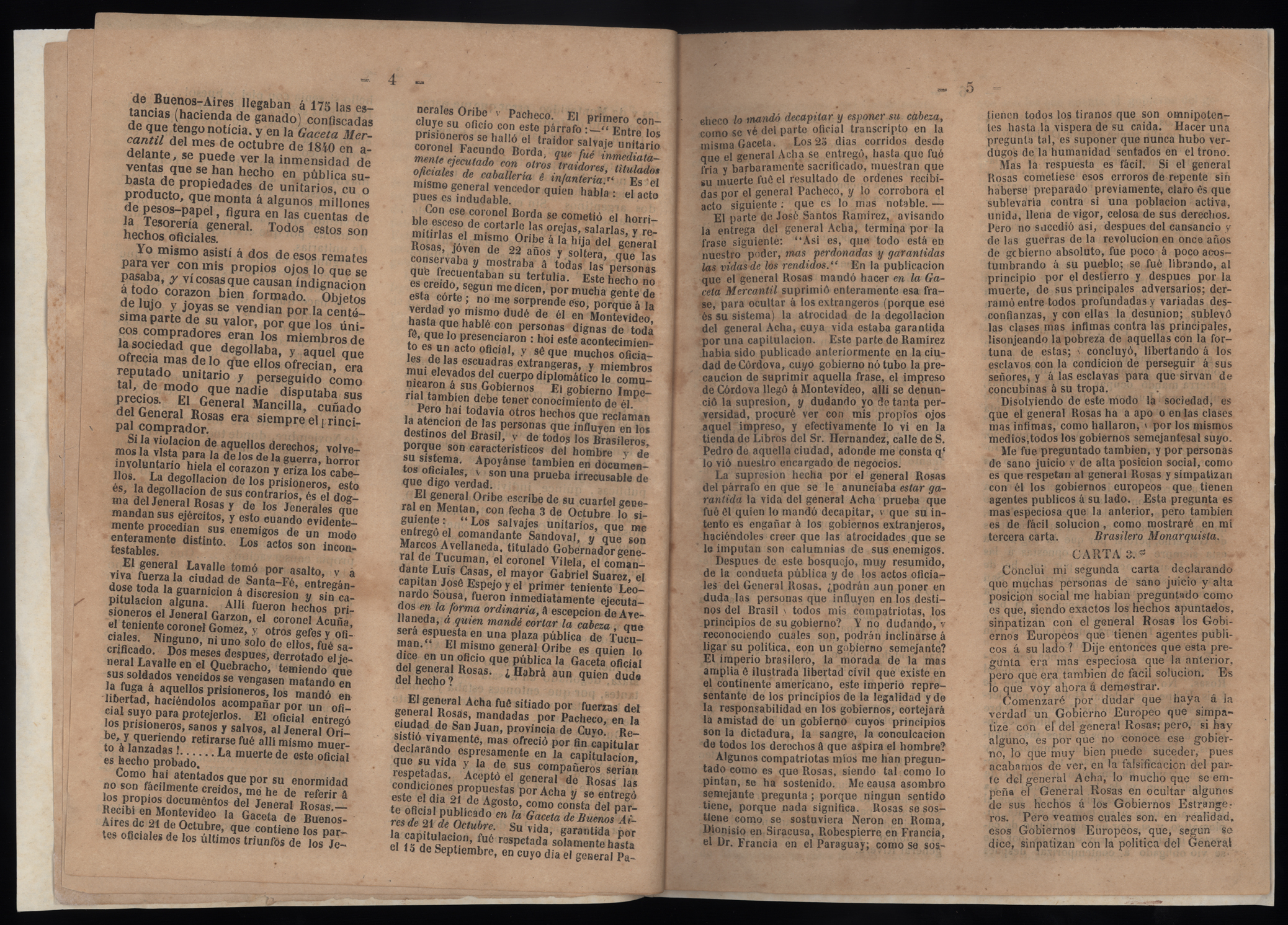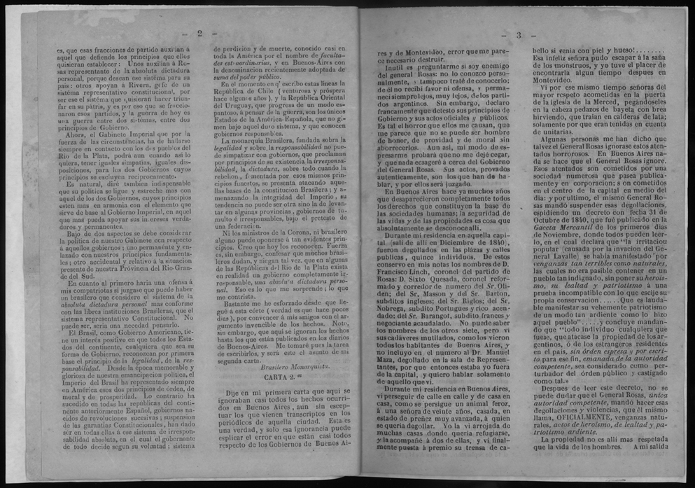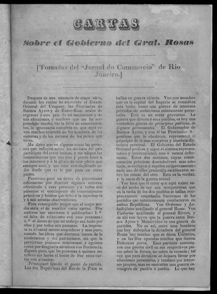 This work brings together three letters about Rosas rule from the Brazilian newspaper Jornal do commercio. Written by an Argentine in exile and signed "Brazilian Monarchist," the letters summarize the crimes of Rosas and the harm he does to the republic. The writer claims the Federalist war against Uruguay, declared in 1838, is based solely on the personal, dogmatic beliefs of Rosas. Further, he highlights the fact that both Brazil and Uruguay have constitutional democratic governments, as opposed to Rosas dictatorship in Argentina.