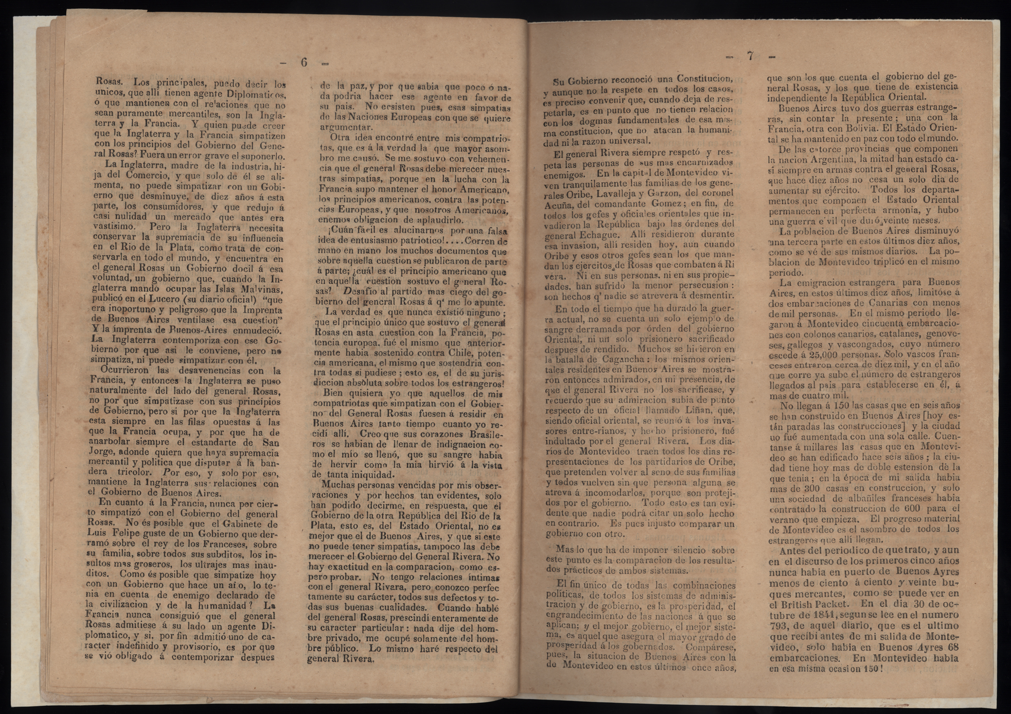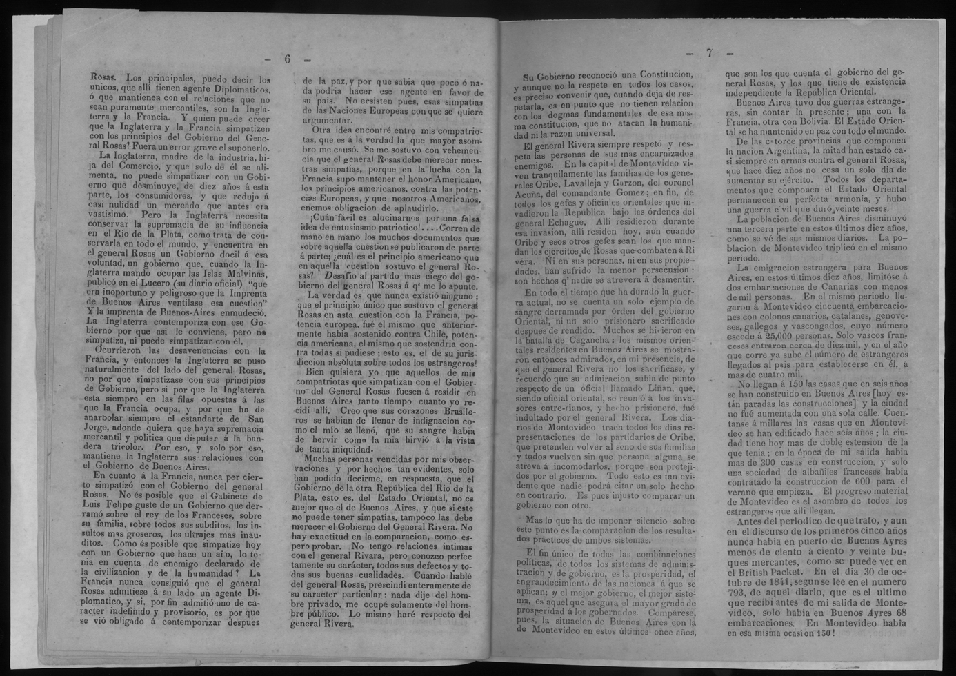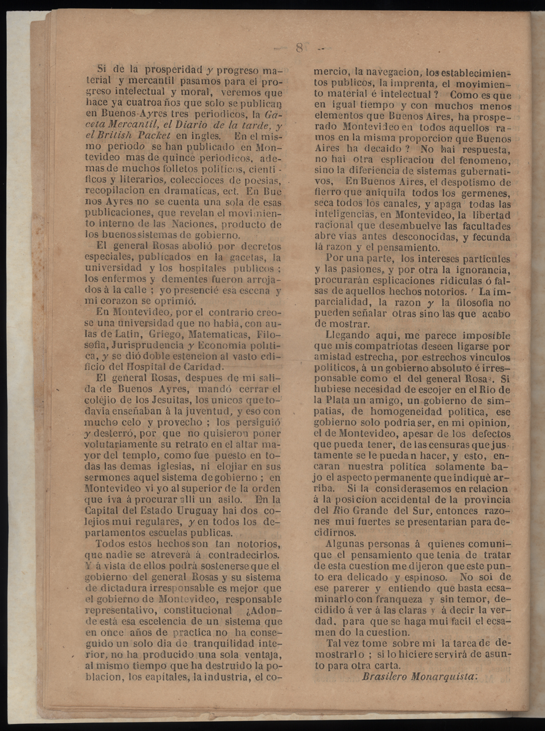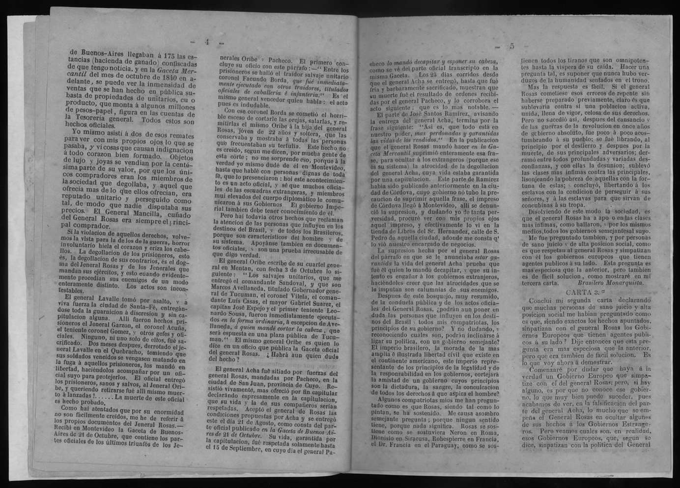 This work brings together three letters about Rosas rule from the Brazilian newspaper Jornal do commercio. Written by an Argentine in exile and signed "Brazilian Monarchist," the letters summarize the crimes of Rosas and the harm he does to the republic. The writer claims the Federalist war against Uruguay, declared in 1838, is based solely on the personal, dogmatic beliefs of Rosas. Further, he highlights the fact that both Brazil and Uruguay have constitutional democratic governments, as opposed to Rosas dictatorship in Argentina.